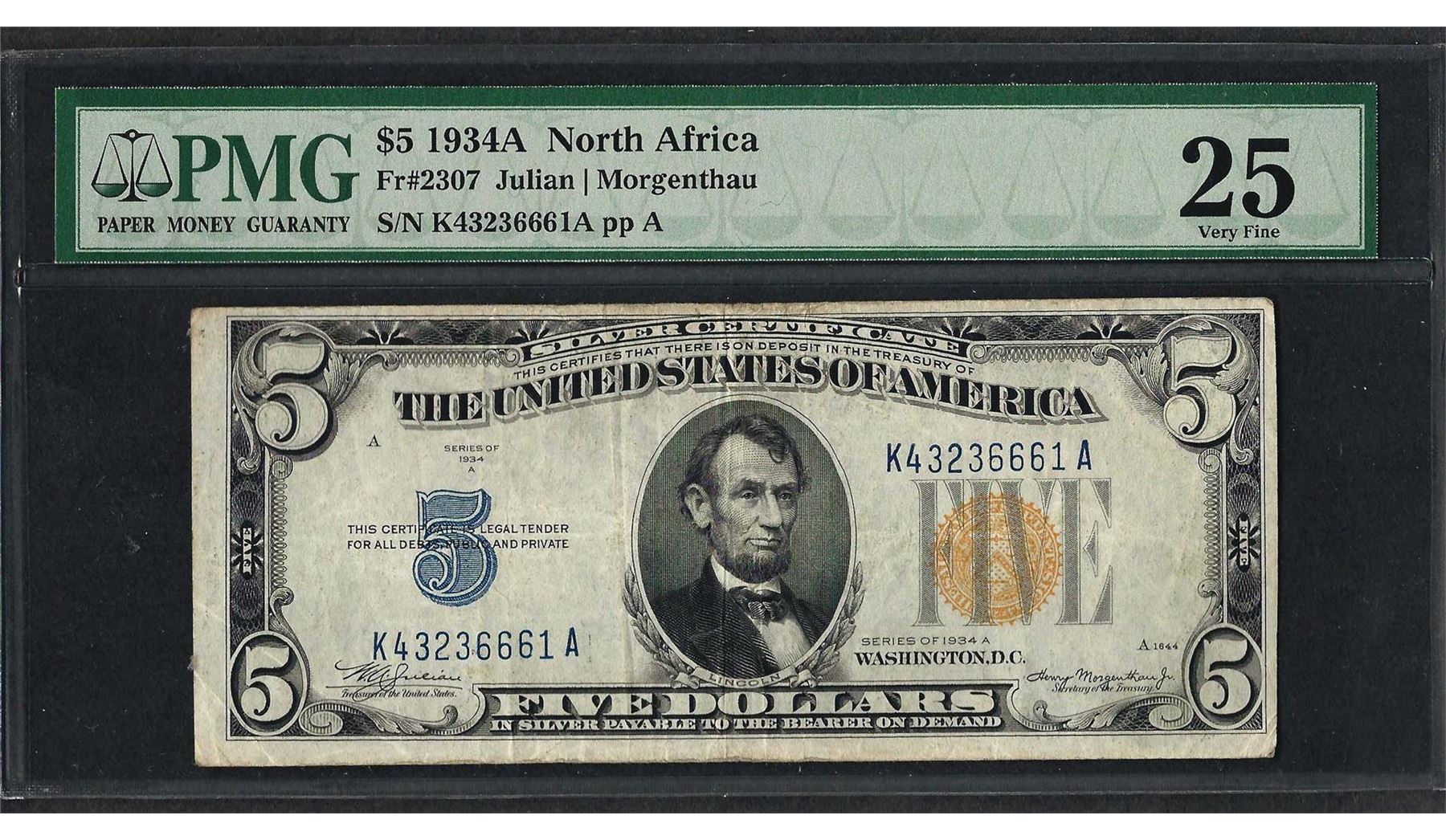 One 1934A $5 North Africa Silver Certificate WWII Emergency Note Fr.2307 PMG Very Fine 25. PMG Certified.
