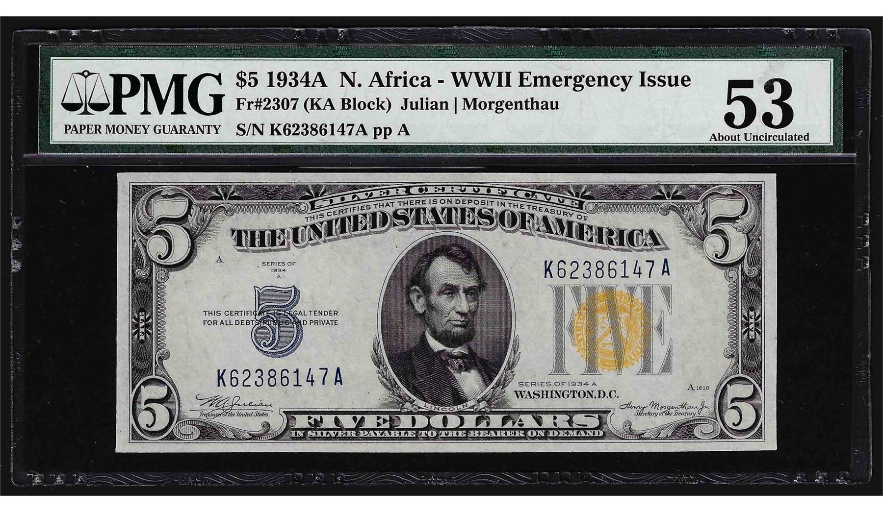 1934A $5 North Africa Silver Certificate WWII Emergency Note PMG AU53