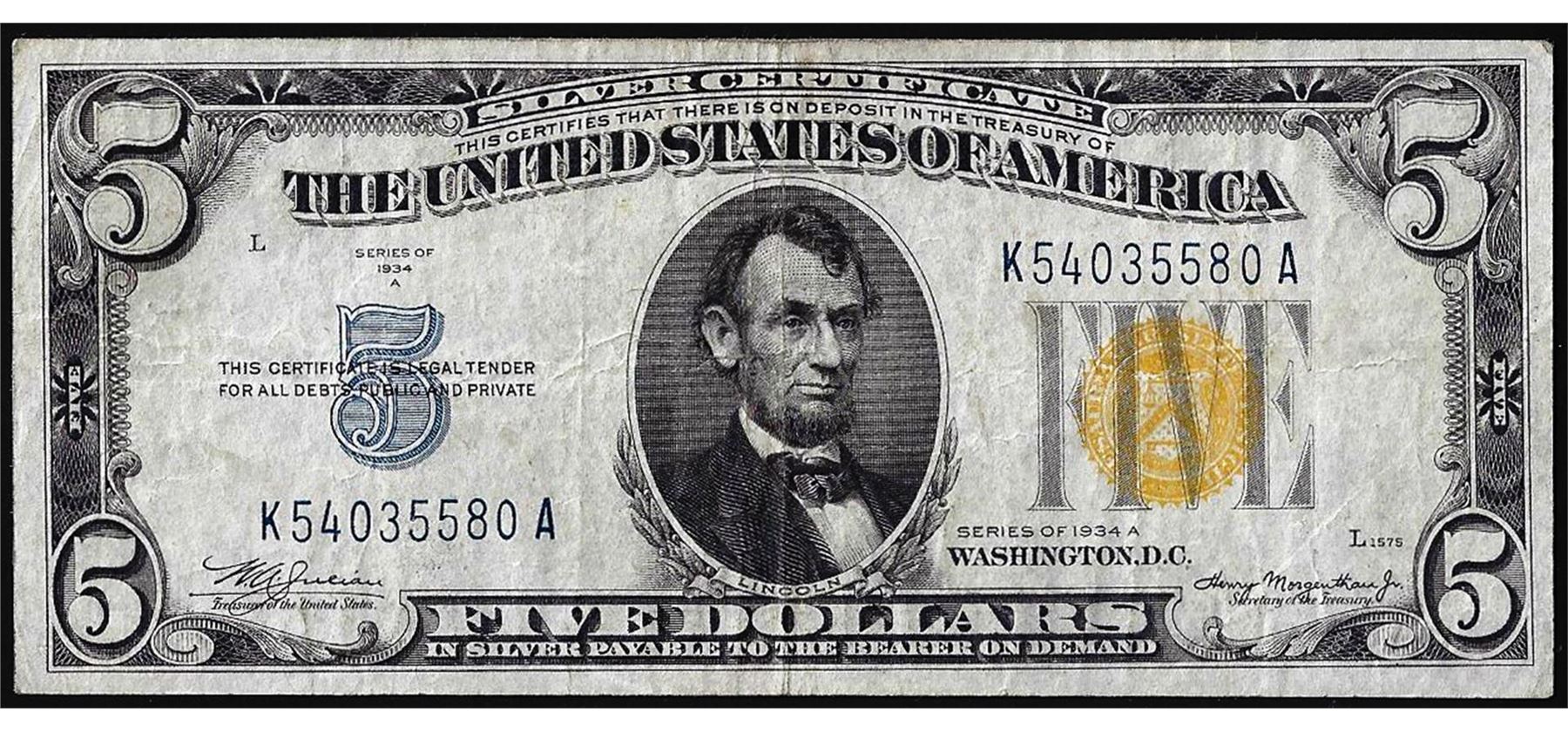 One 1934A $5 North Africa Silver Certificate WWII Emergency Note.
