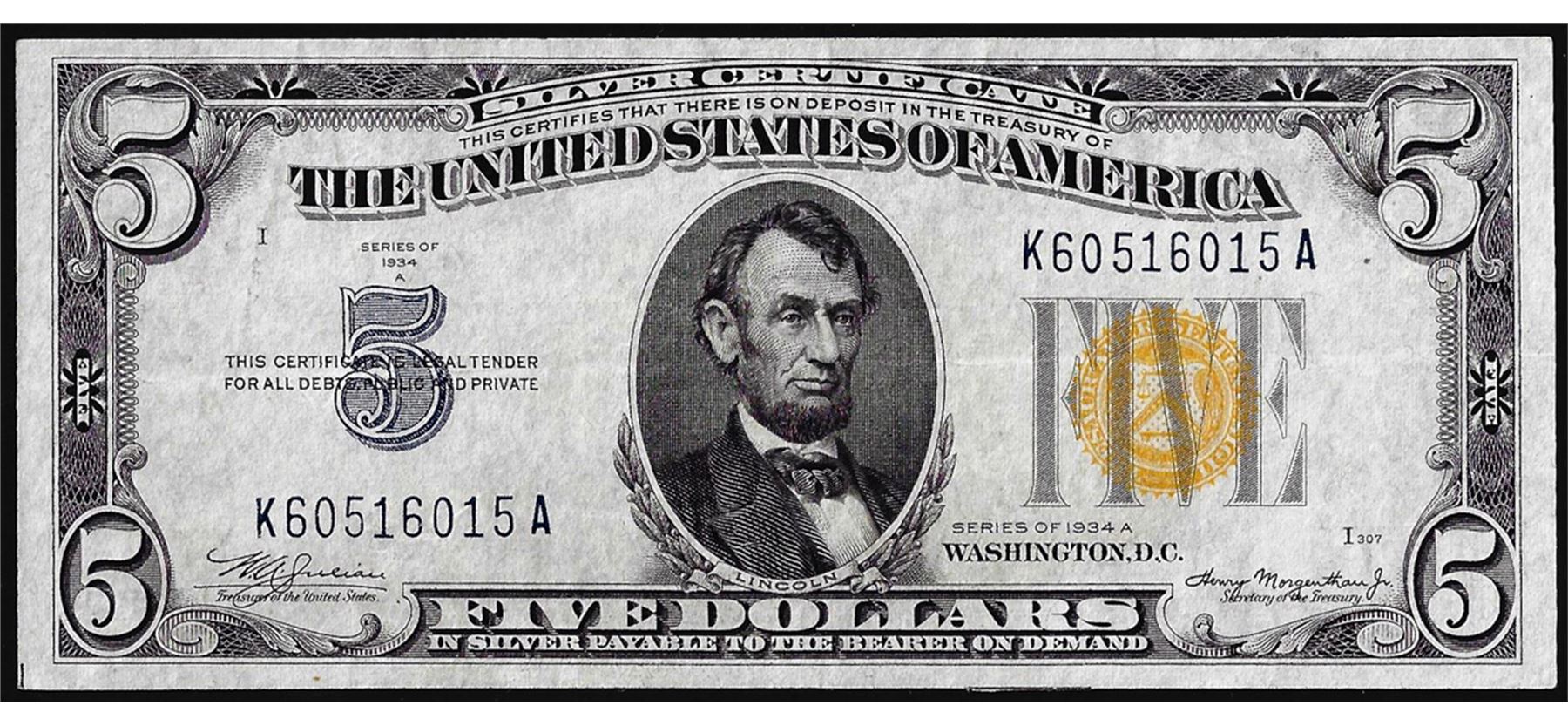 One 1934A $5 North Africa WWII Emergency Issue Silver Certificate Note.