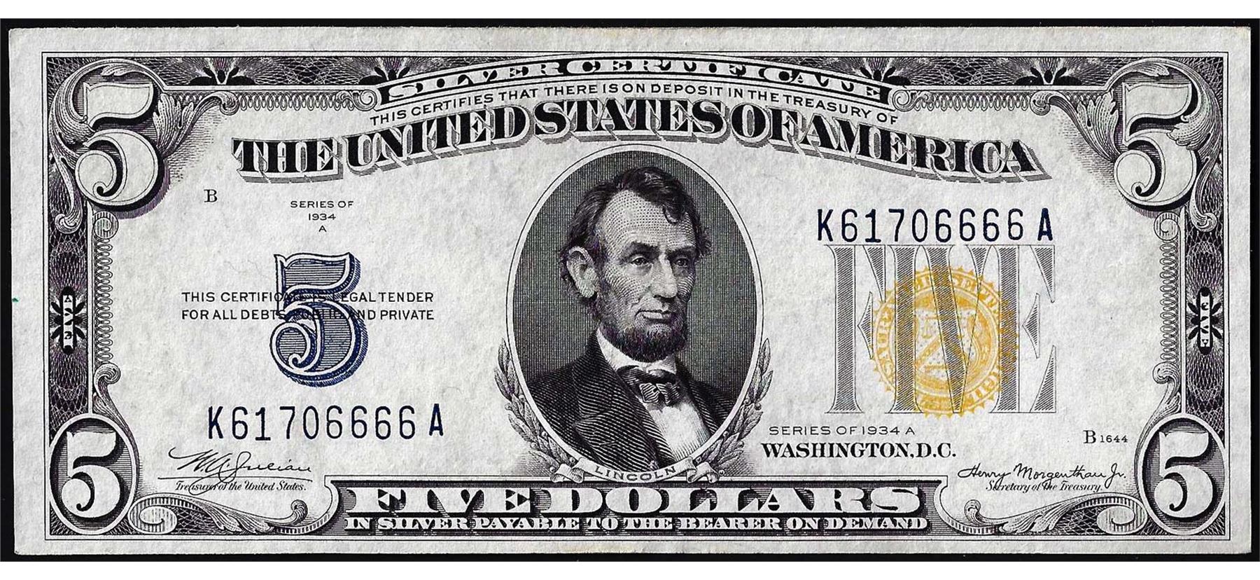 One 1934A $5 North Africa WWII Emergency Issue Silver Certificate Note.