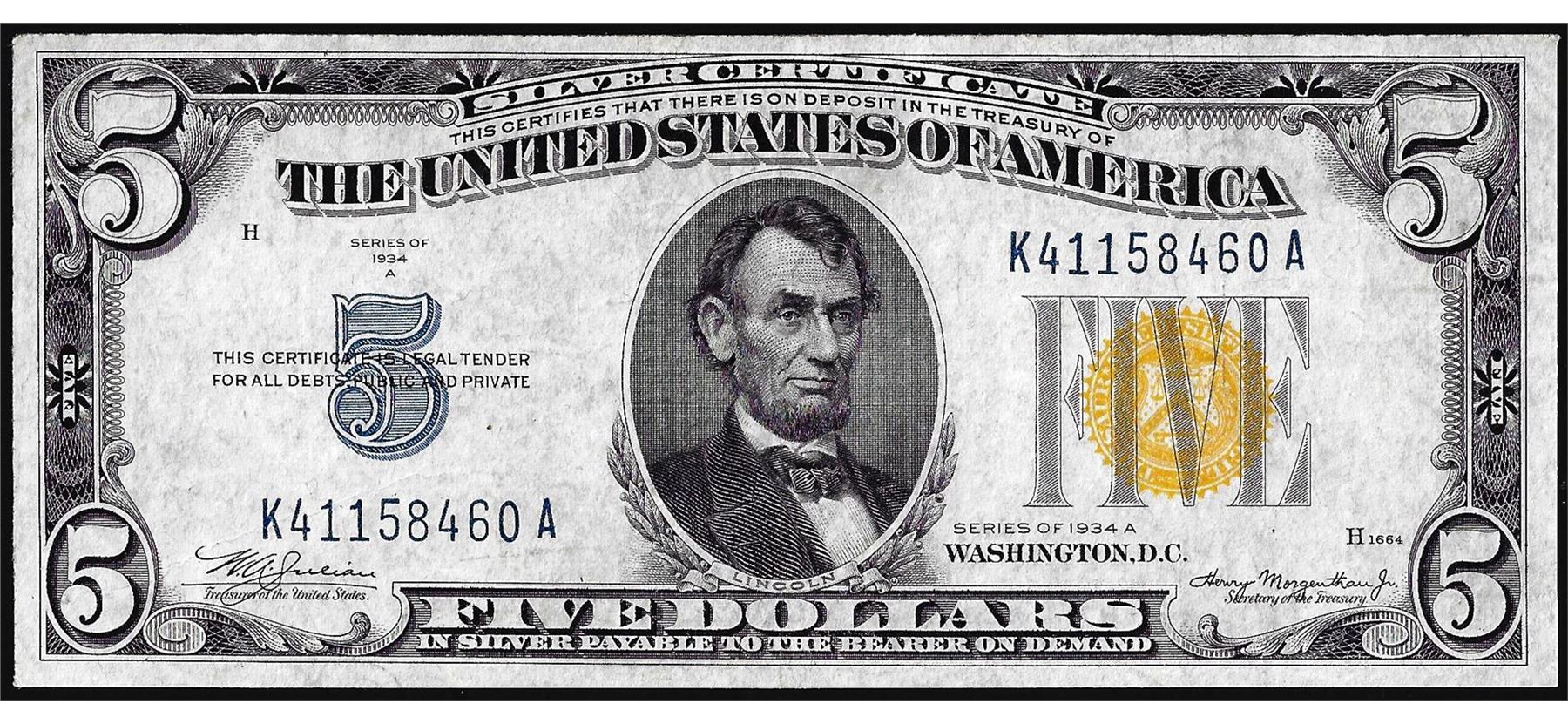 One 1934A $5 North Africa WWII Emergency Issue Silver Certificate Note.