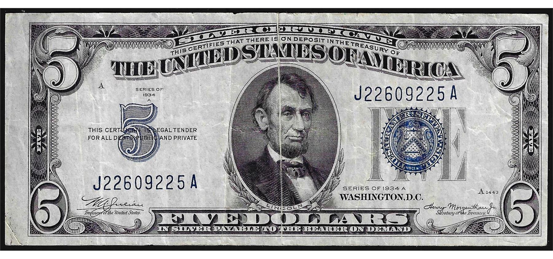 One 1934A $5 Silver Certificate Note ERROR Gutterfold.