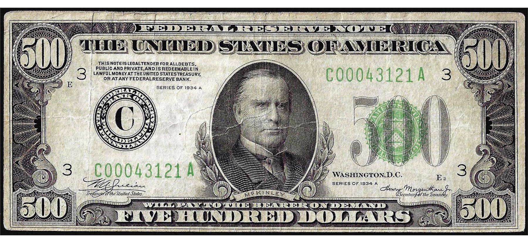 One 1934A $500 Federal Reserve Bank Note Philadelphia.