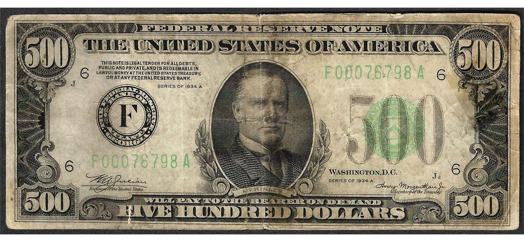One 1934A $500 Federal Reserve Note Atlanta.