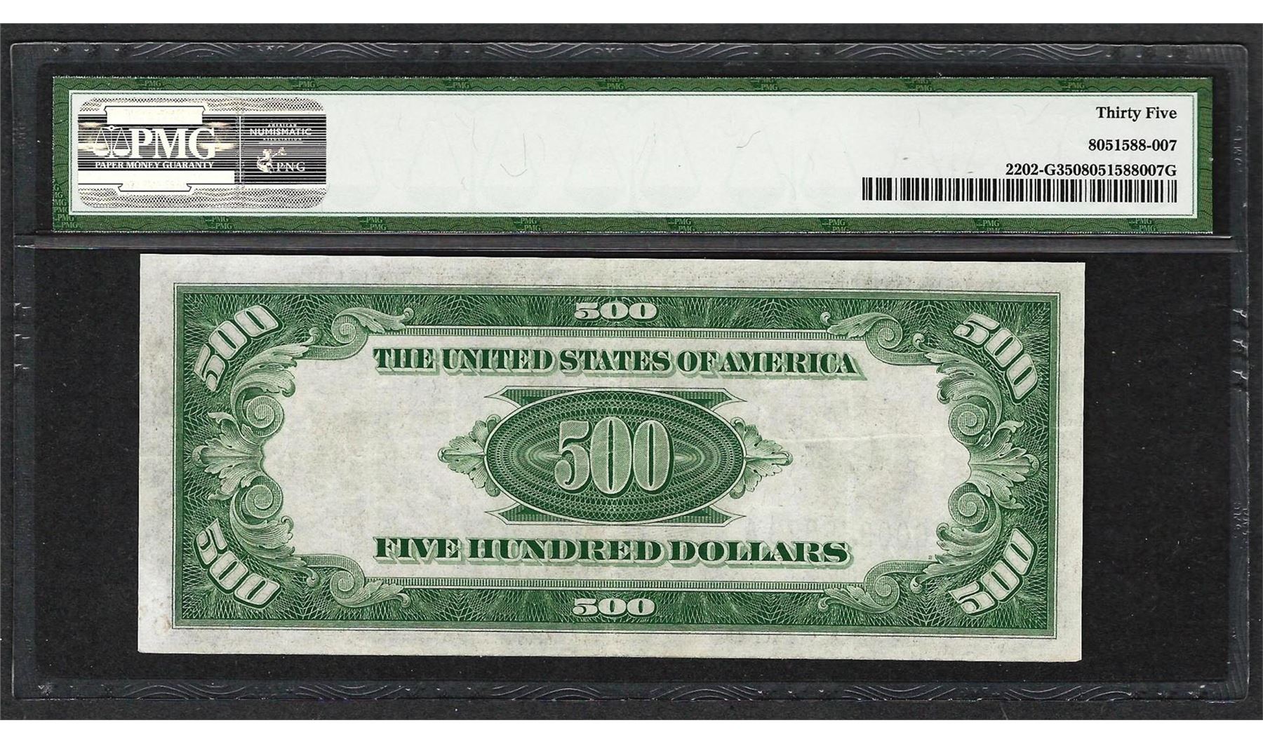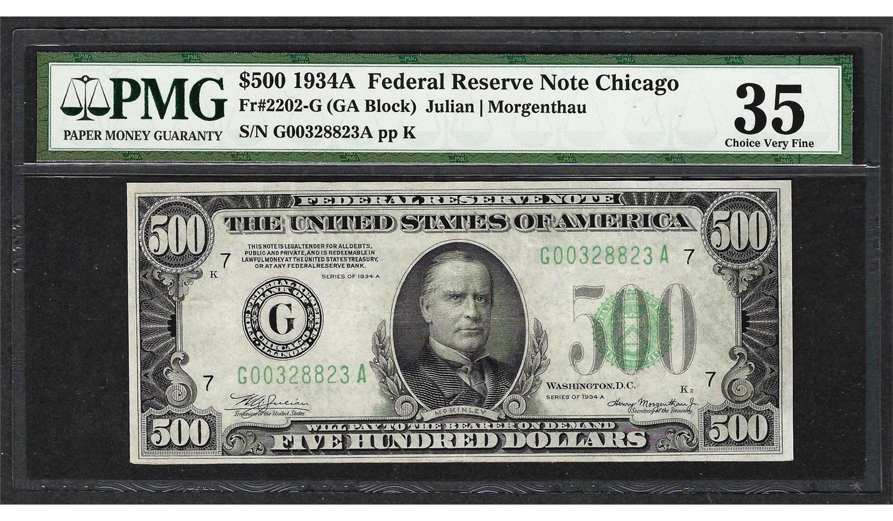 One 1934A $500 Federal Reserve Note Chicago Fr.2202-G PMG Choice Very Fine 35. PMG Certified.