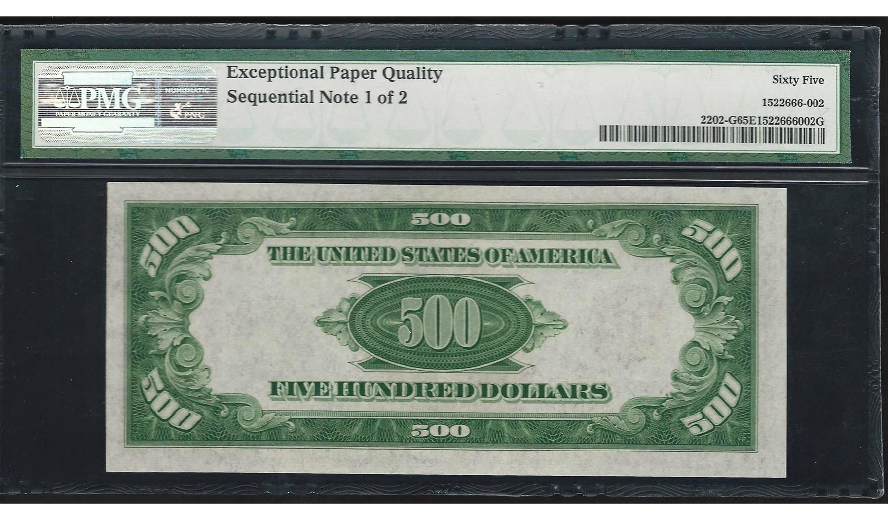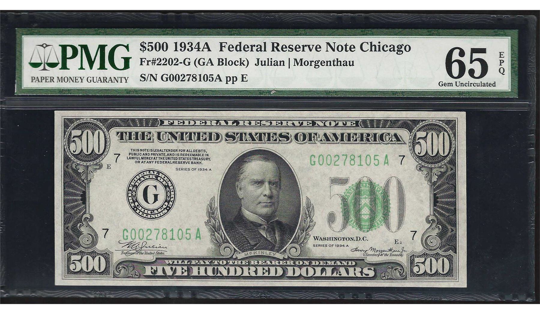 One 1934A $500 Federal Reserve Note Chicago Fr.2202-G PMG Gem Uncirculated 65EPQ. PMG Certified.