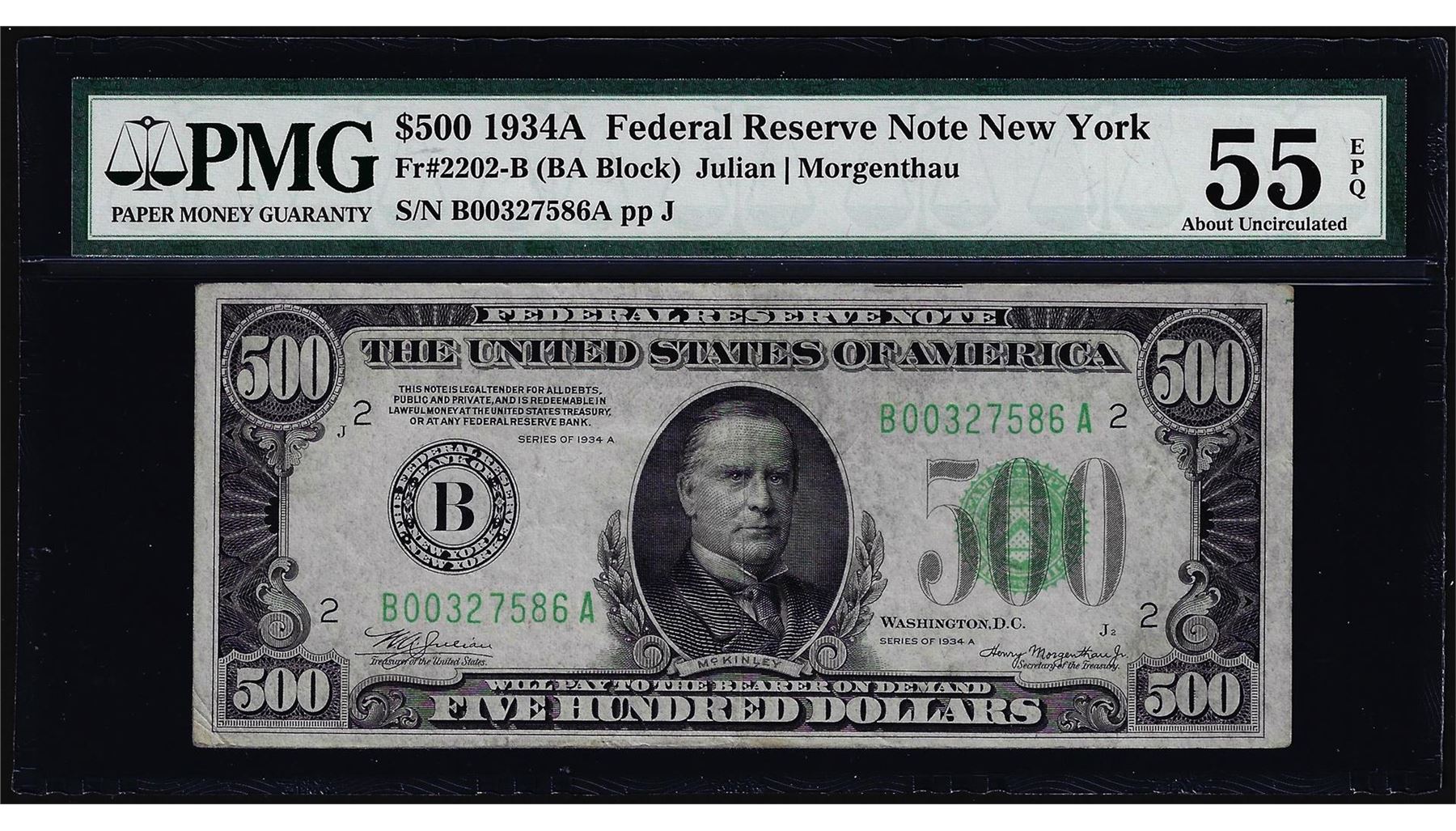 One 1934A $500 Federal Reserve Note Fr.2202-B PMG About Uncirculated 55EPQ. PMG Certified.