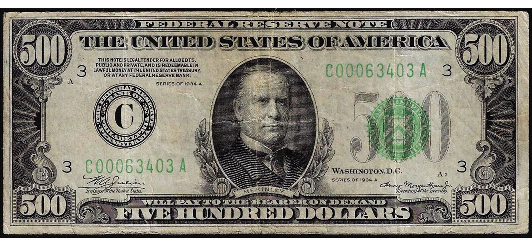 One 1934A $500 Federal Reserve Note Philadelphia.