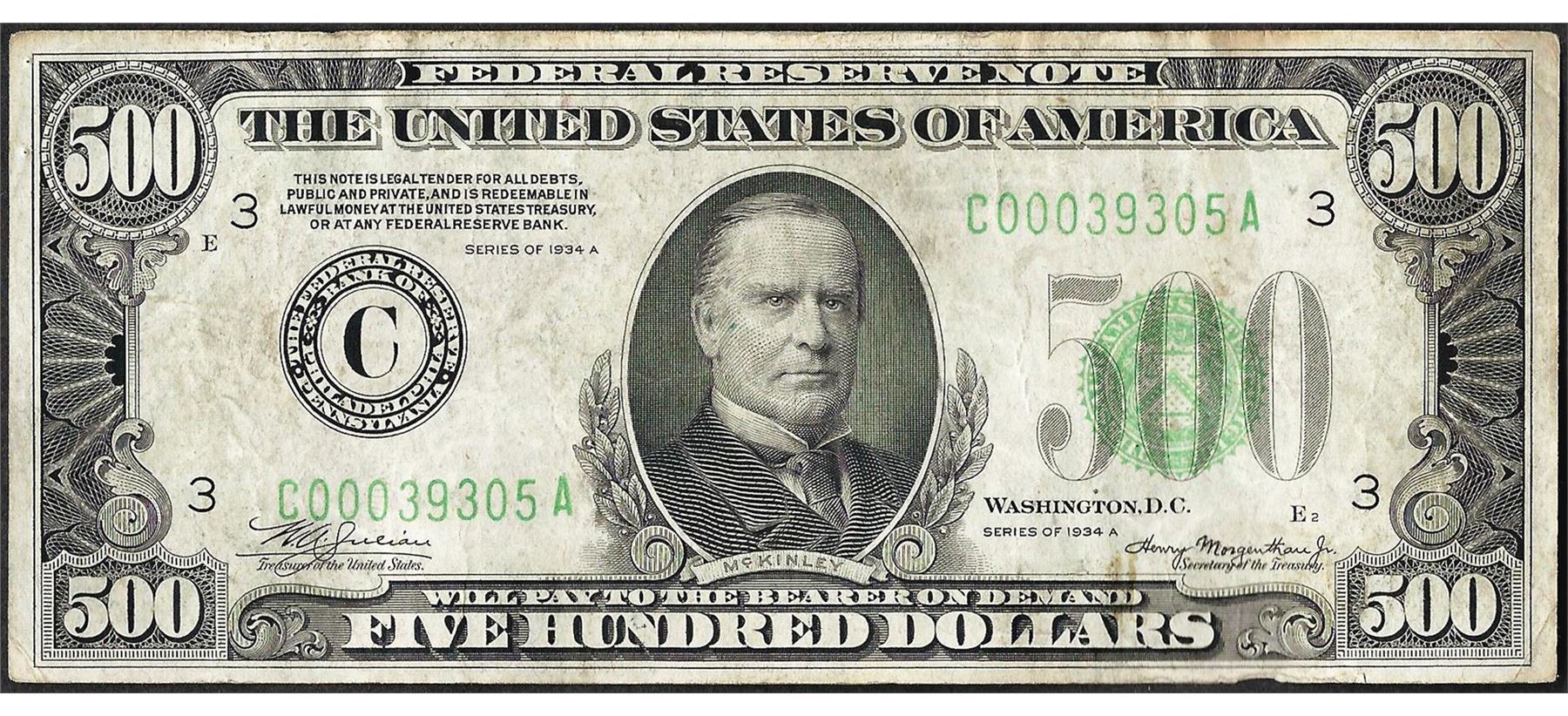 One 1934A $500 Federal Reserve Note Philadelphia.