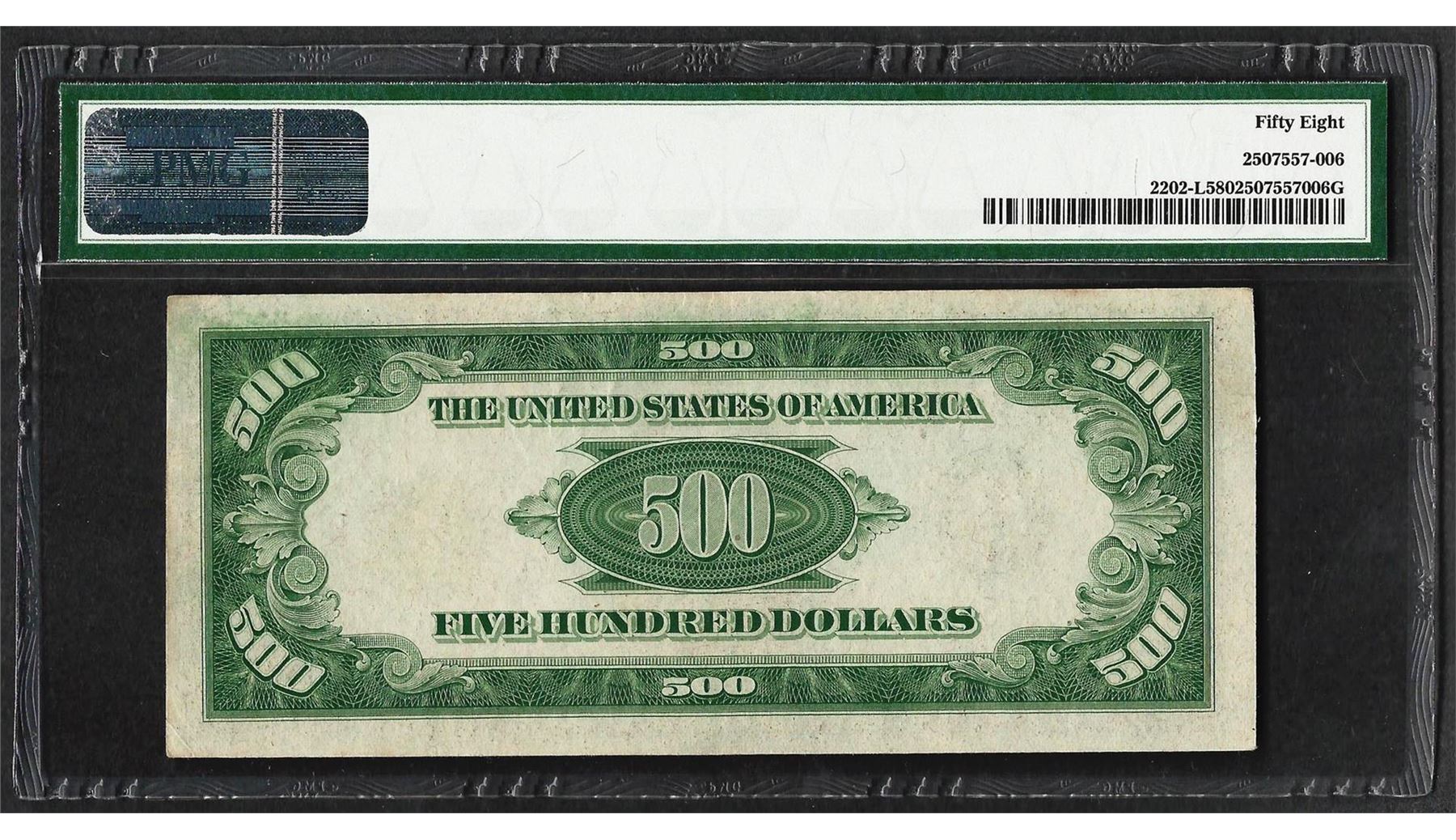One 1934A $500 Federal Reserve Note San Francisco Fr.2202-L PMG Choice About Unc. 58. PMG Certified.