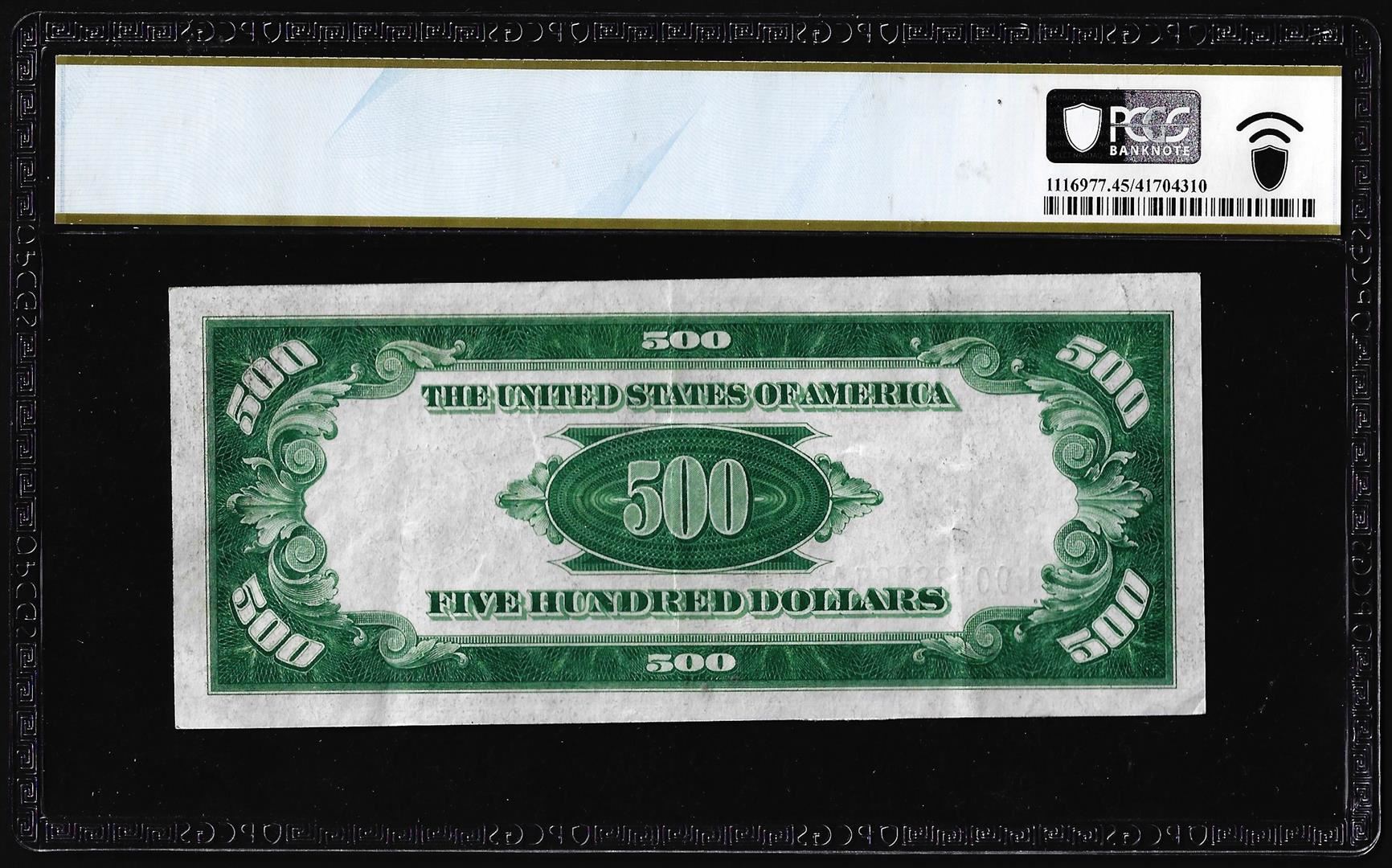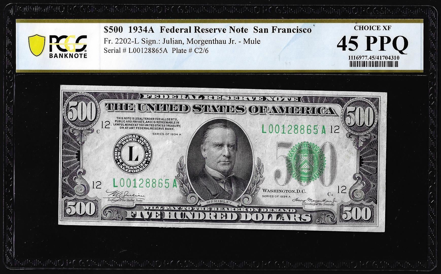 One 1934A $500 Federal Reserve Note San Francisco PCGS Choice Extremely Fine 45PPQ. PCGS Graded.