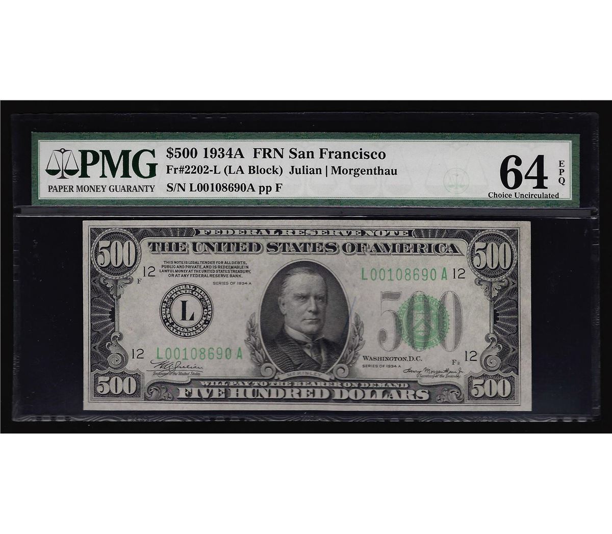 One 1934A $500 Federal Reserve Note San Francisco PMG Choice Uncirculated 64EPQ. PMG Certified.