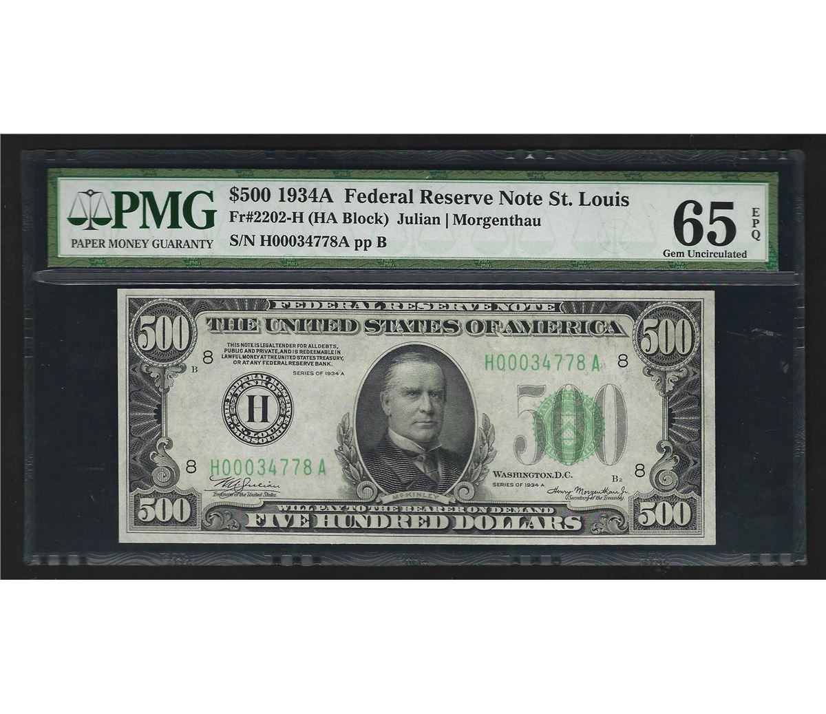 One 1934A $500 Federal Reserve Note St. Louis PMG Gem Uncircluated 65EPQ. PMG Certified.