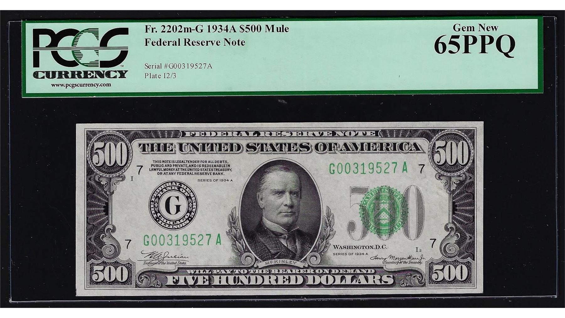 One 1934A $500 Mule Federal Reserve Note Chicago PCGS Gem New 65PPQ. PCGS Graded.
