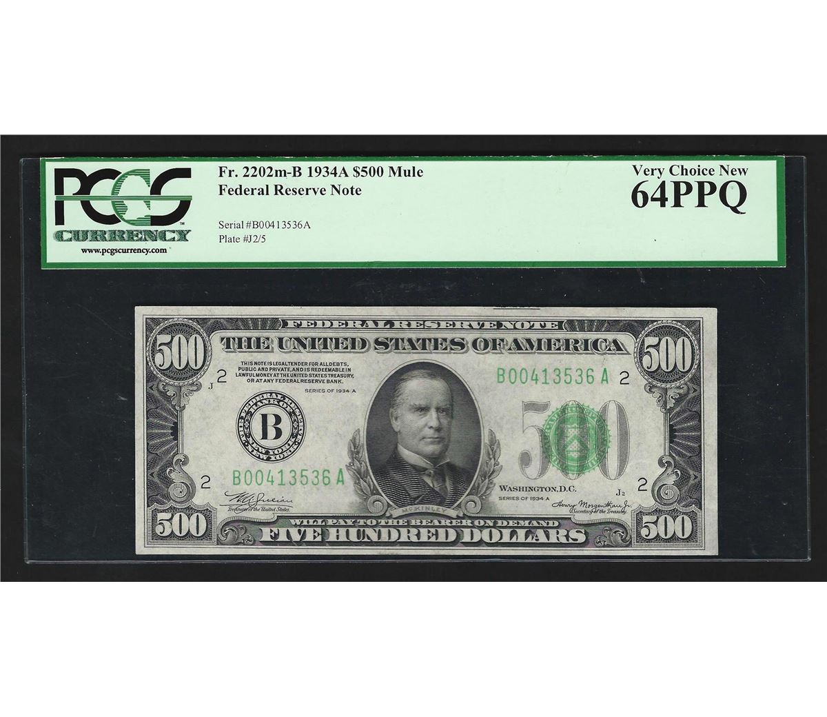 One 1934A $500 Mule Federal Reserve Note New York PMG Very Choice New 64PPQ. PMG Certified.