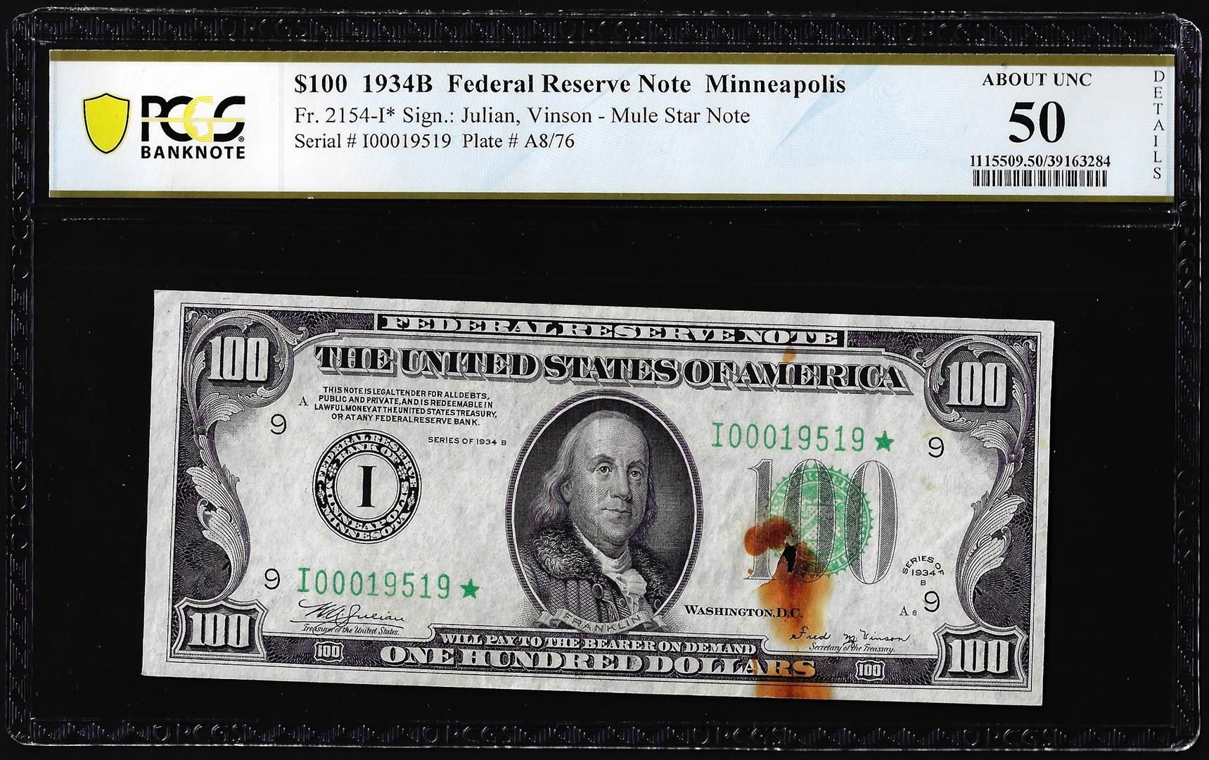 One 1934B $100 Federal Reserve Star Note Fr.2154-I* Minneapolis PCGS About Unc. 50 Details. PCGS Graded.