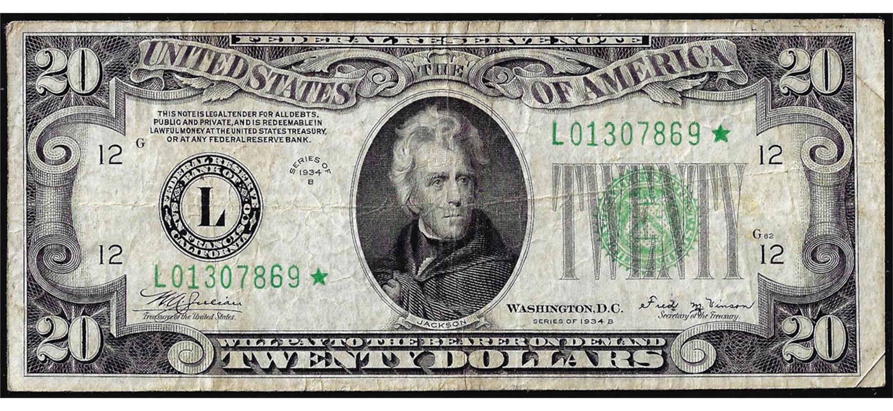 One 1934B $20 Federal Reserve STAR Note San Francisco.