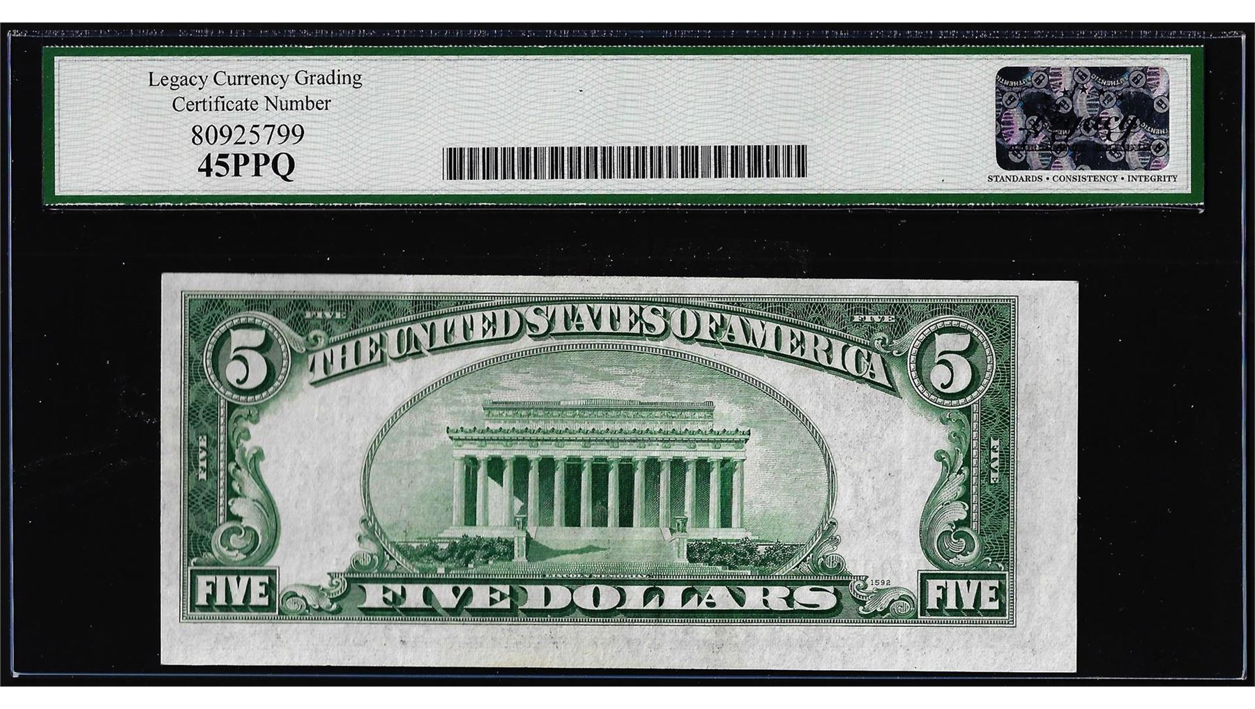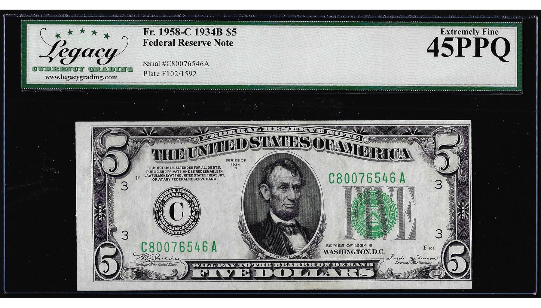 One 1934B $5 Federal Reserve Note Fr.1958-C Legacy Extremely Fine 45PPQ. Legacy Graded.