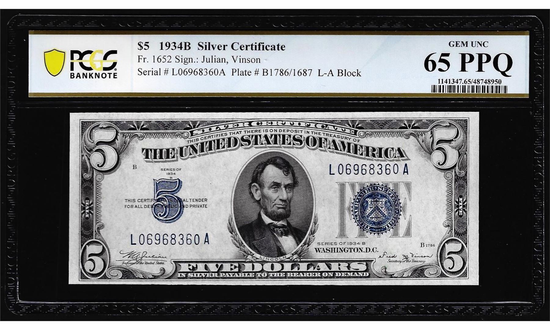 One 1934B $5 Silver Certificate Note Fr.1652 PCGS Gem Uncirculated 65PPQ. PCGS Graded.