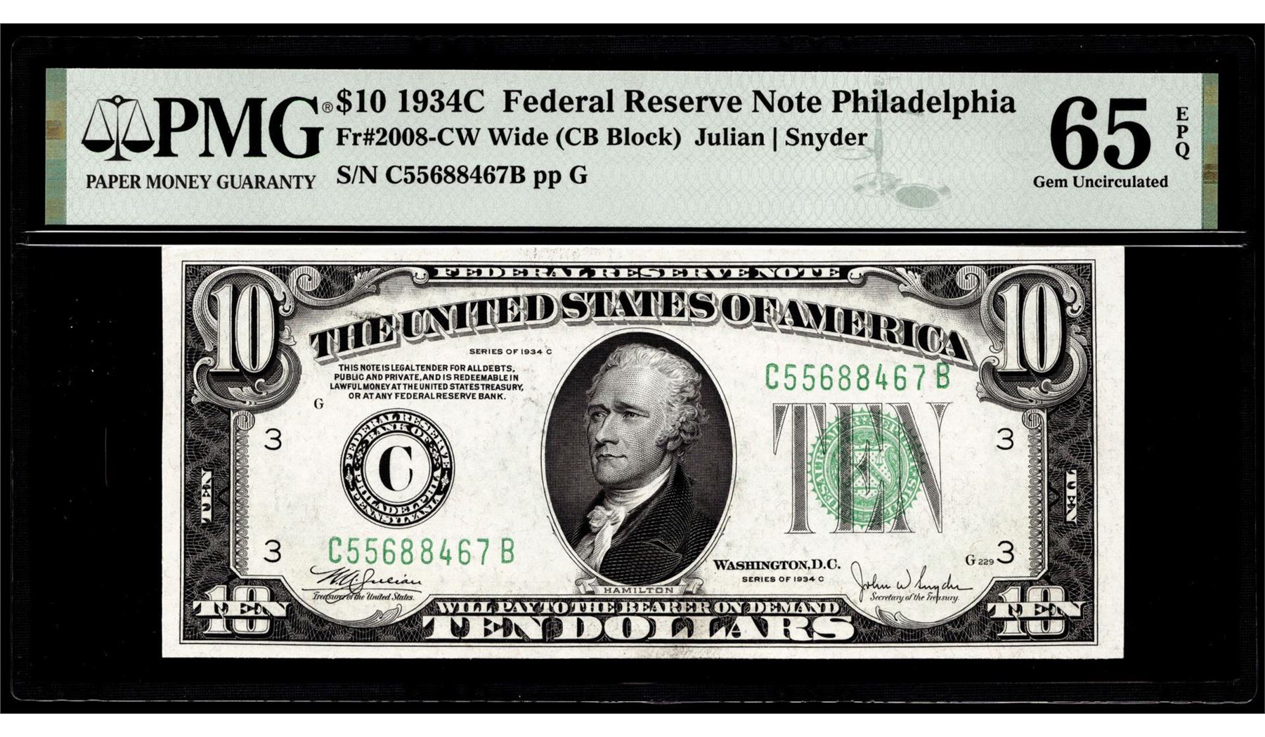 One 1934C $10 Federal Reserve Note Philadelphia Fr.2008-CW PMG Gem Uncirculated 65EPQ. PMG Certified.