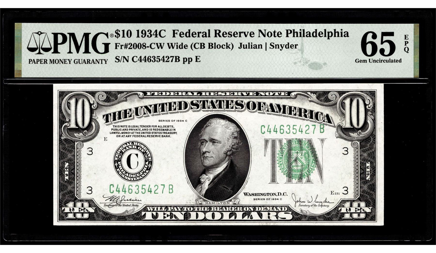 One 1934C $10 Federal Reserve Note Philadelphia Fr.2008-CW PMG Gem Uncirculated 65EPQ. PMG Certified.