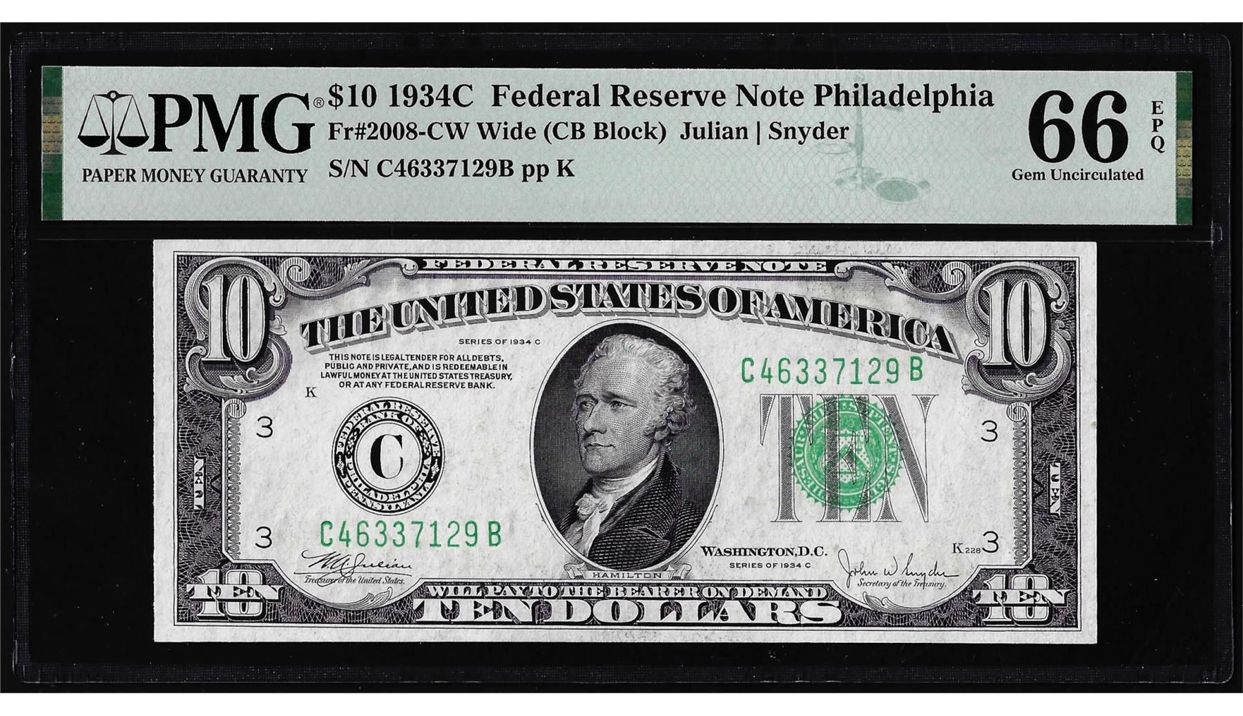 One 1934C $10 Federal Reserve Note Philadelphia Fr.2008-CW PMG Gem Uncirculated 66EPQ. PMG Certified.