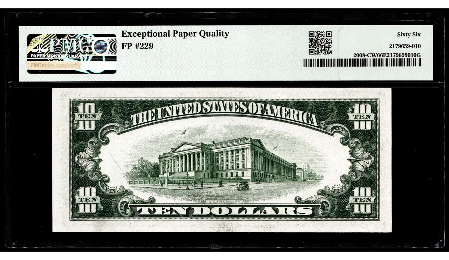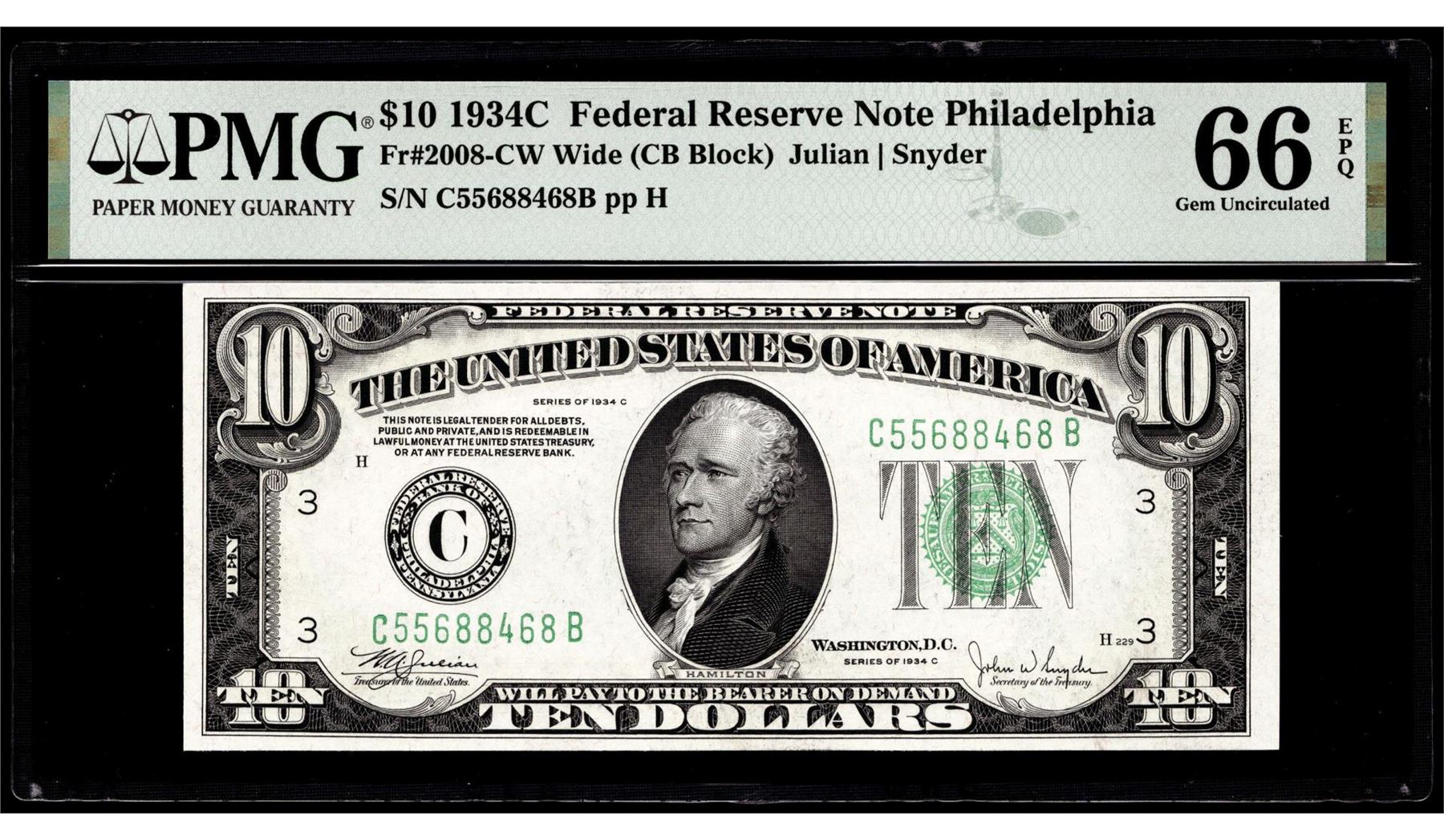 One 1934C $10 Federal Reserve Note Philadelphia Fr.2008-CW PMG Gem Uncirculated 66EPQ. PMG Certified.
