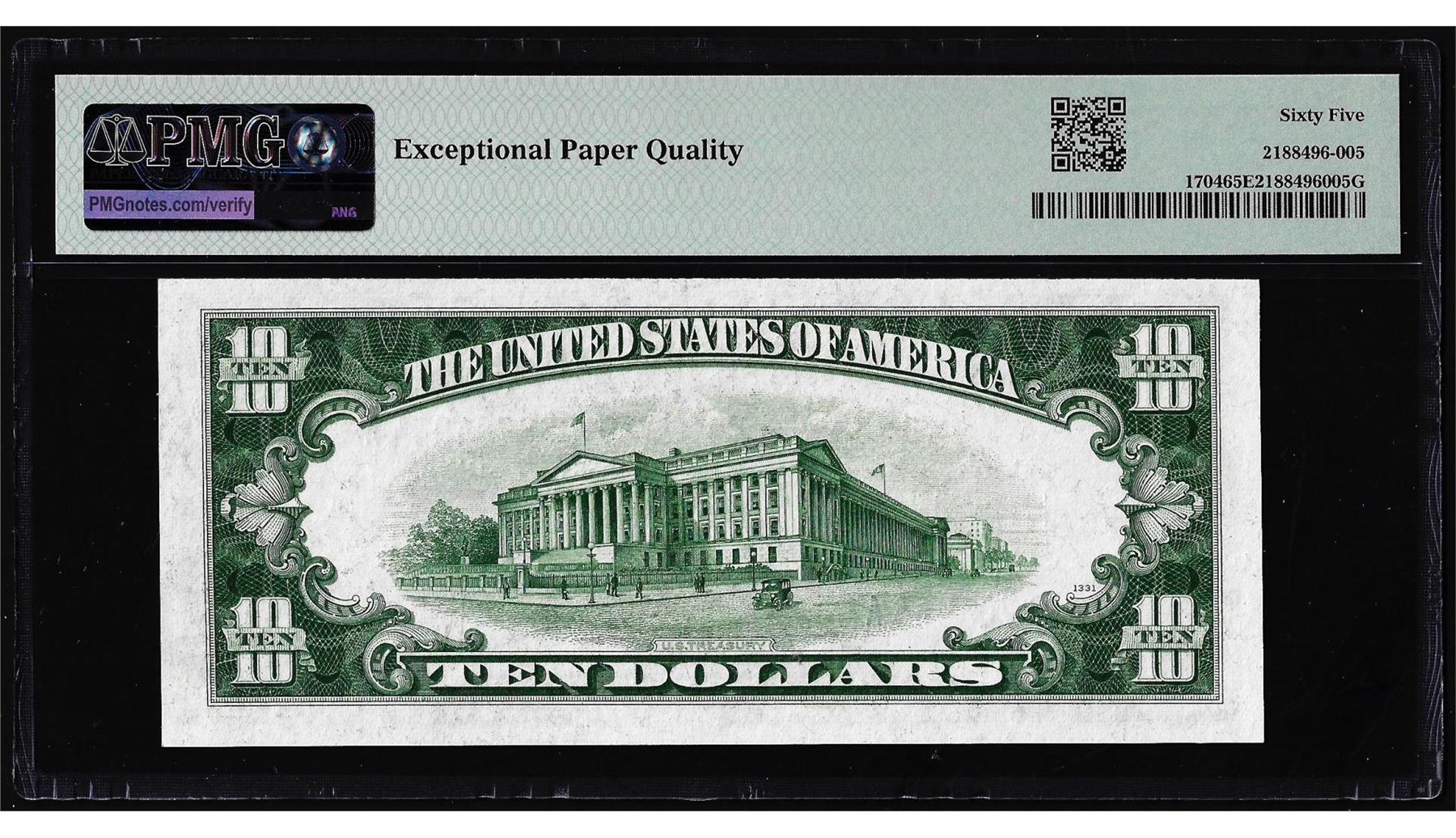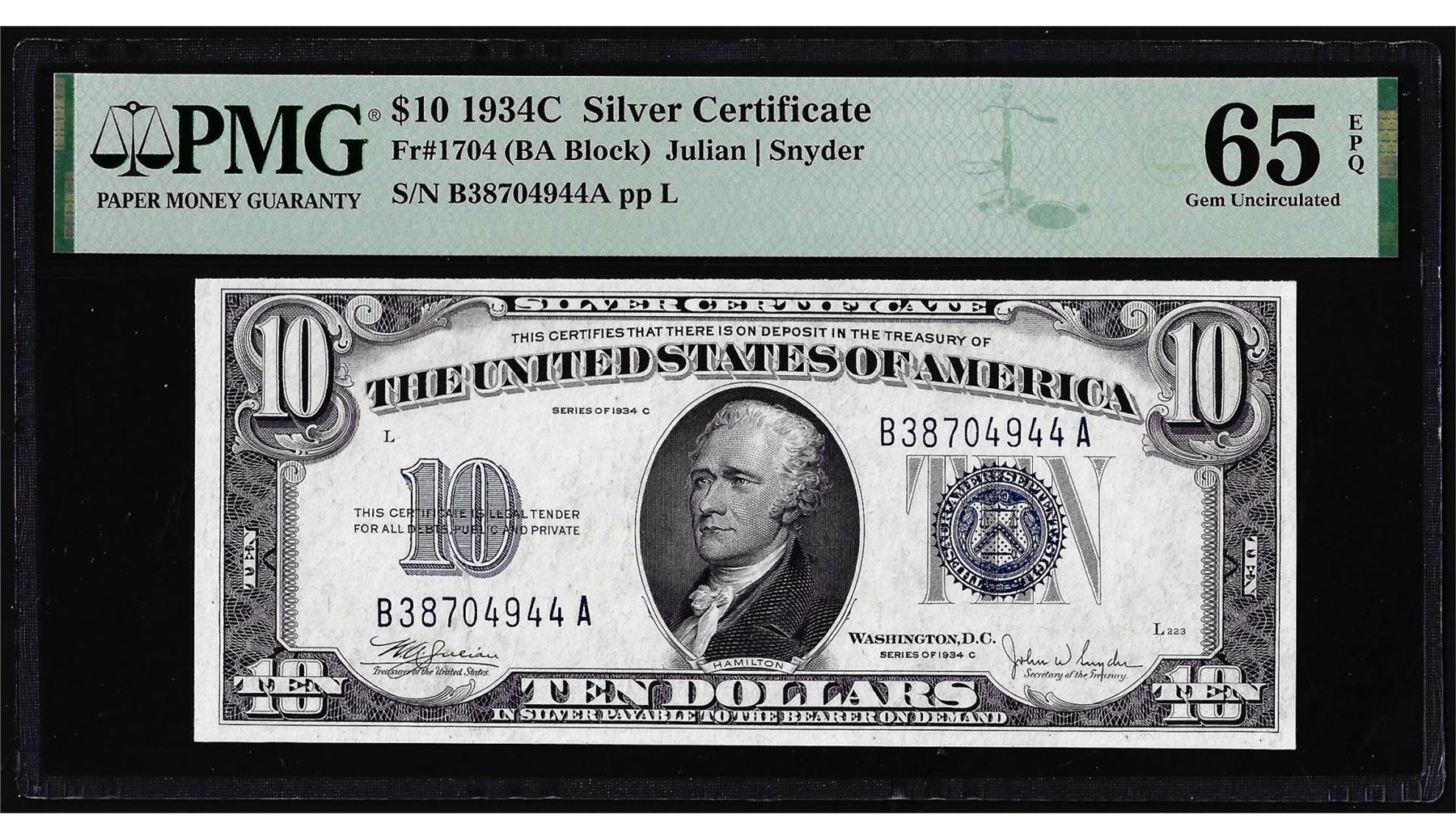 One 1934C $10 Silver Certificate Note Fr.1704 PMG Gem Uncirculated 65EPQ. PMG Certified.