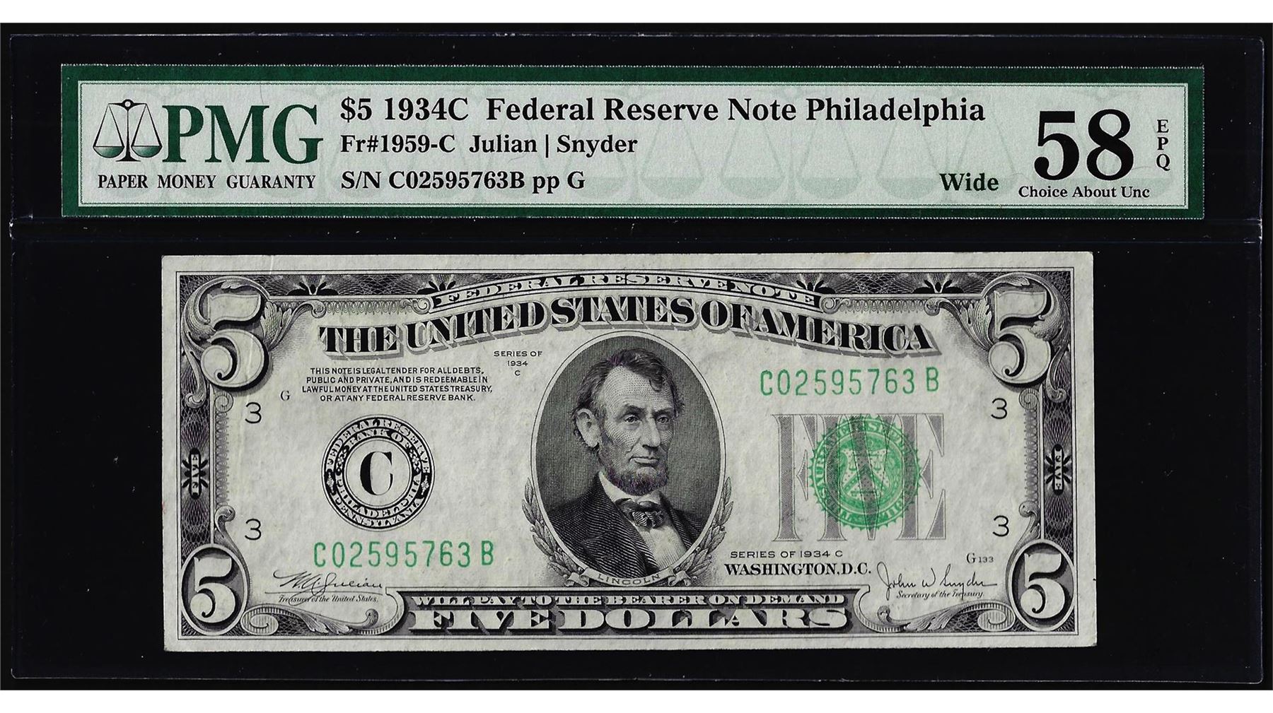 One 1934C $5 Federal Reserve Note Philadelphia Fr.1959-C PMG Choice About Unc. 58EPQ. PMG Certified.