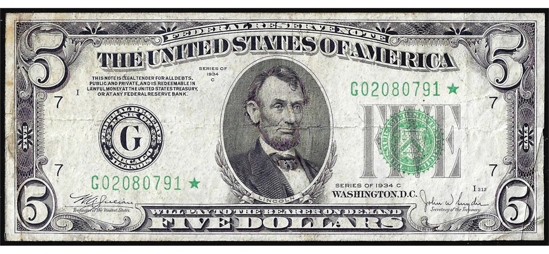 One 1934C $5 Federal Reserve STAR Note Chicago.
