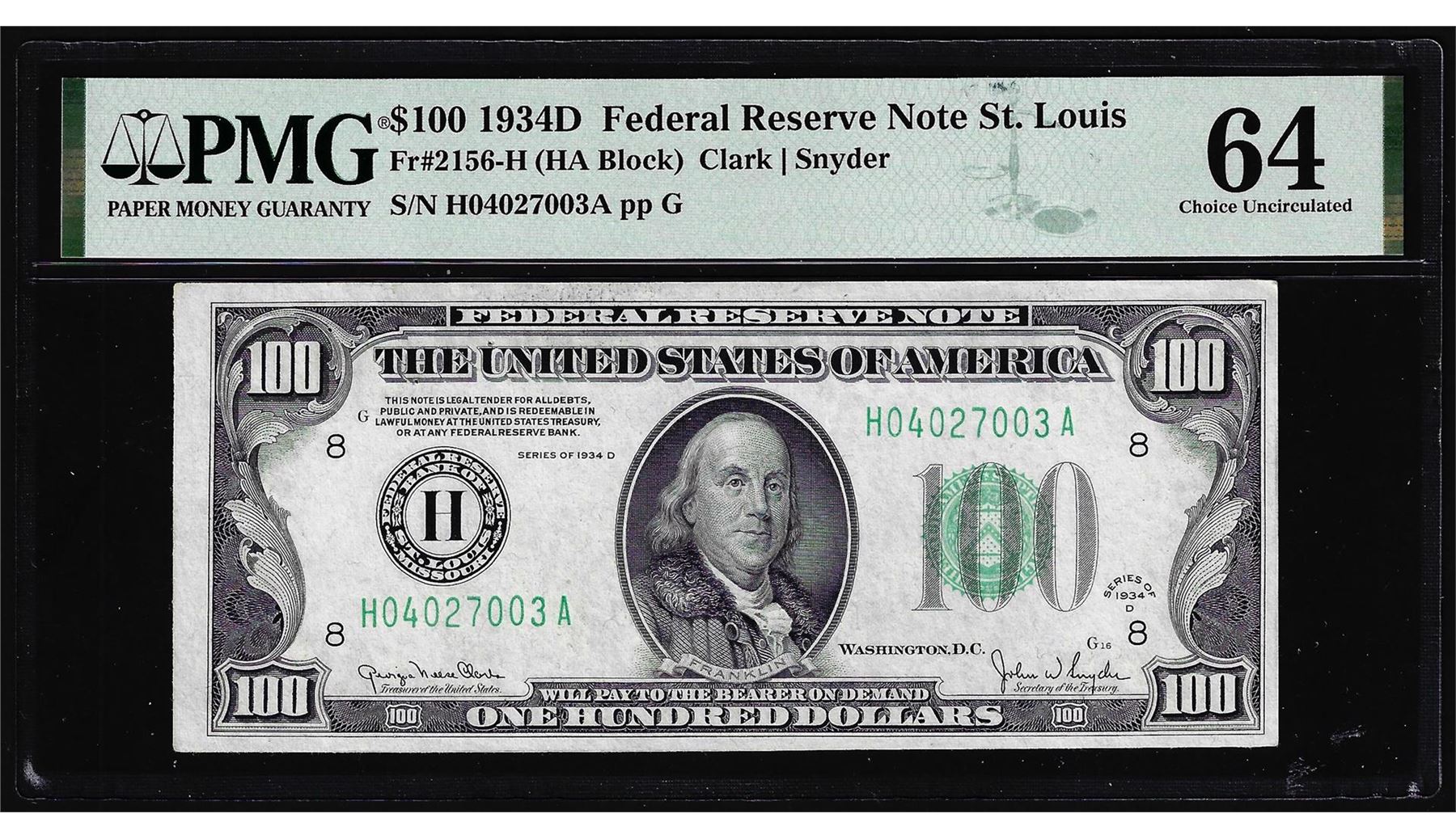 One 1934D $100 Federal Reserve Note Fr.2156-H PMG Choice Uncirculated 64. PMG Certified.