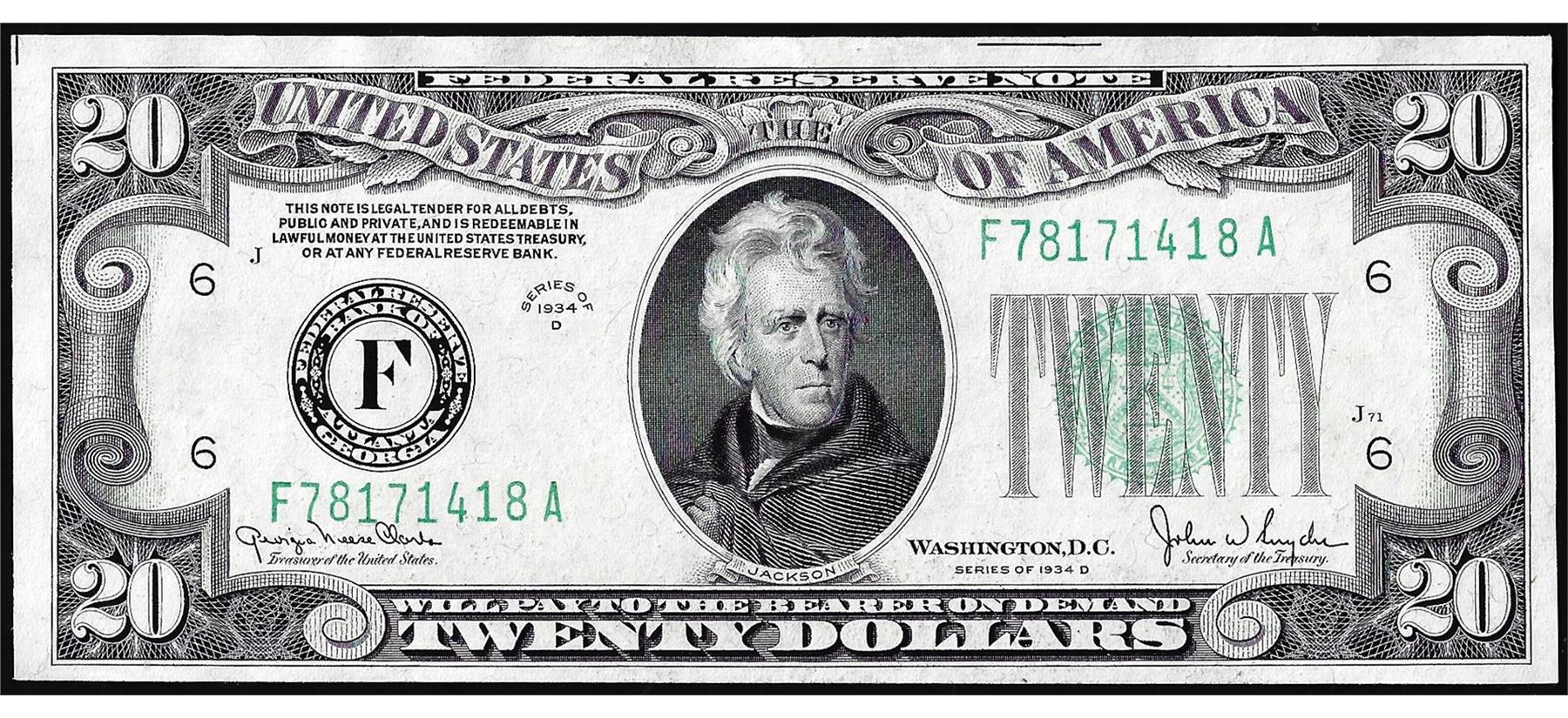 One 1934D $20 Federal Reserve Note Atlanta.