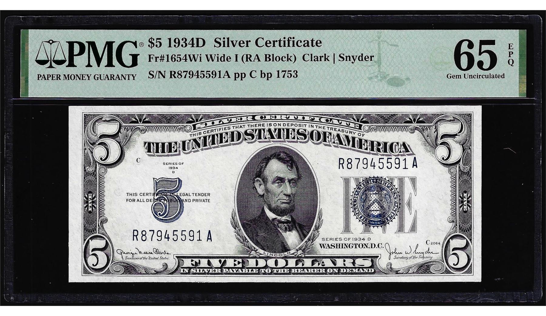 1934D $5 Silver Certificate Note Fr.1654Wi Wide I PMG Gem Uncirculated 65EPQ
