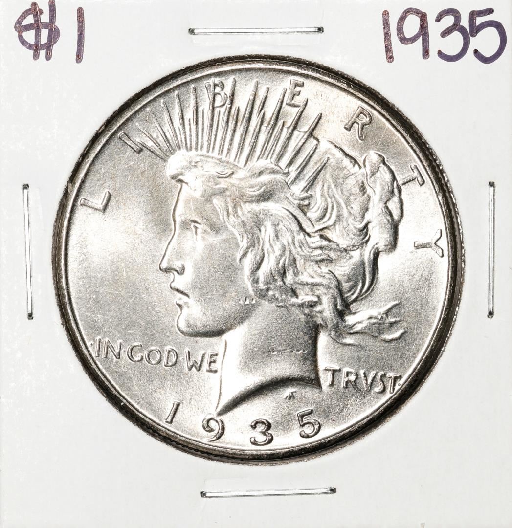 One 1935 $1 Peace Silver Dollar Coin.