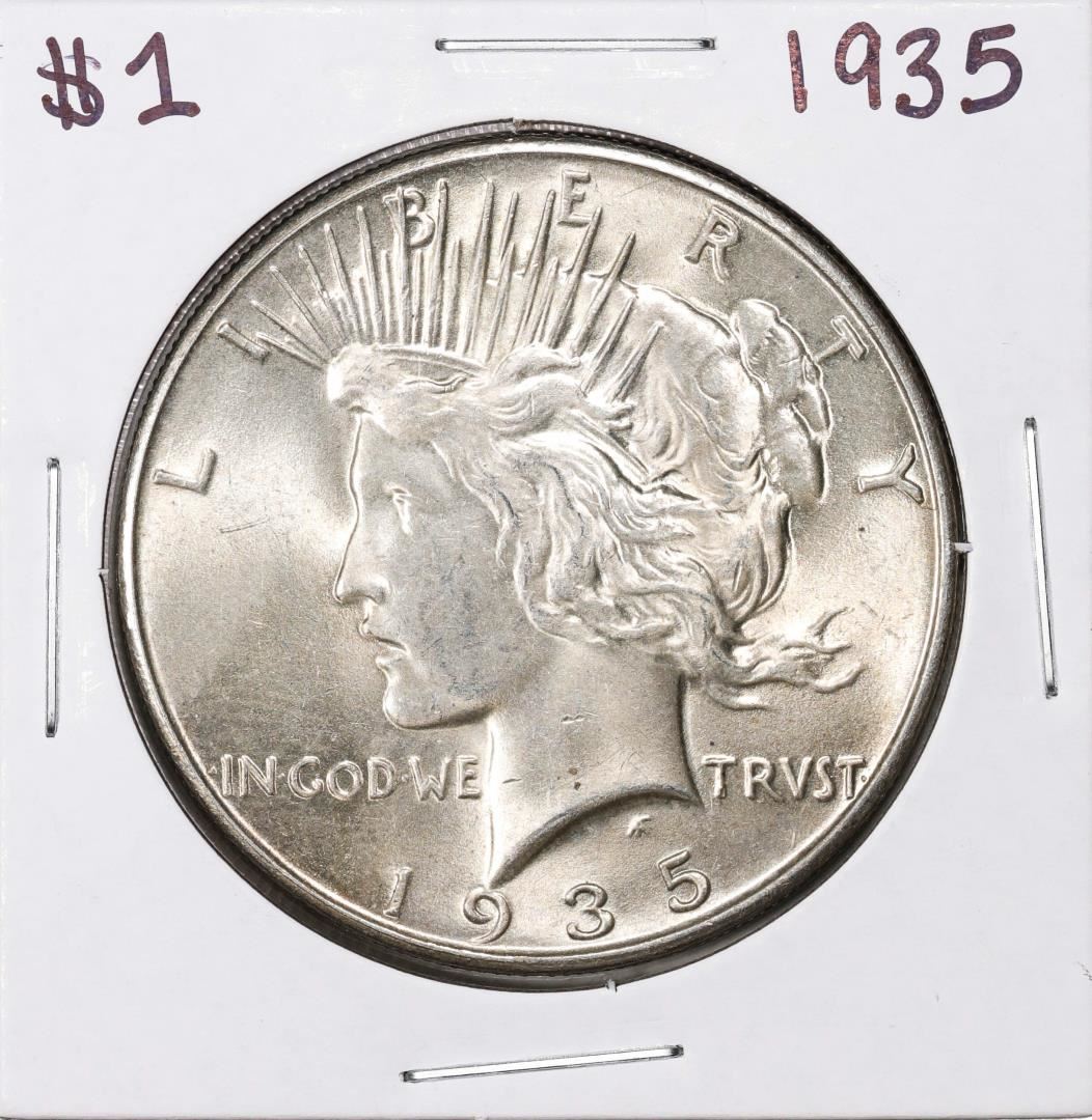 One 1935 $1 Peace Silver Dollar Coin.