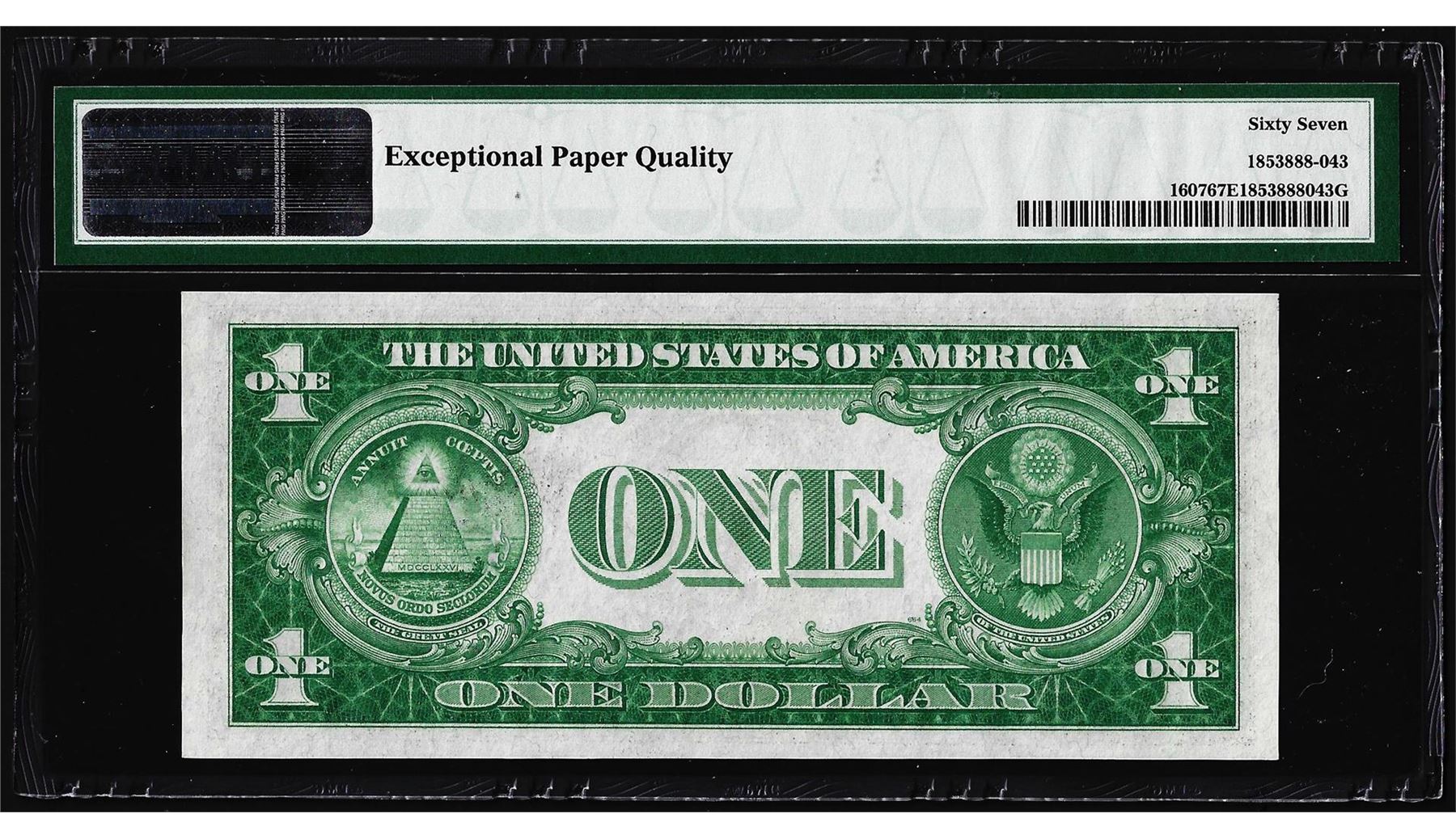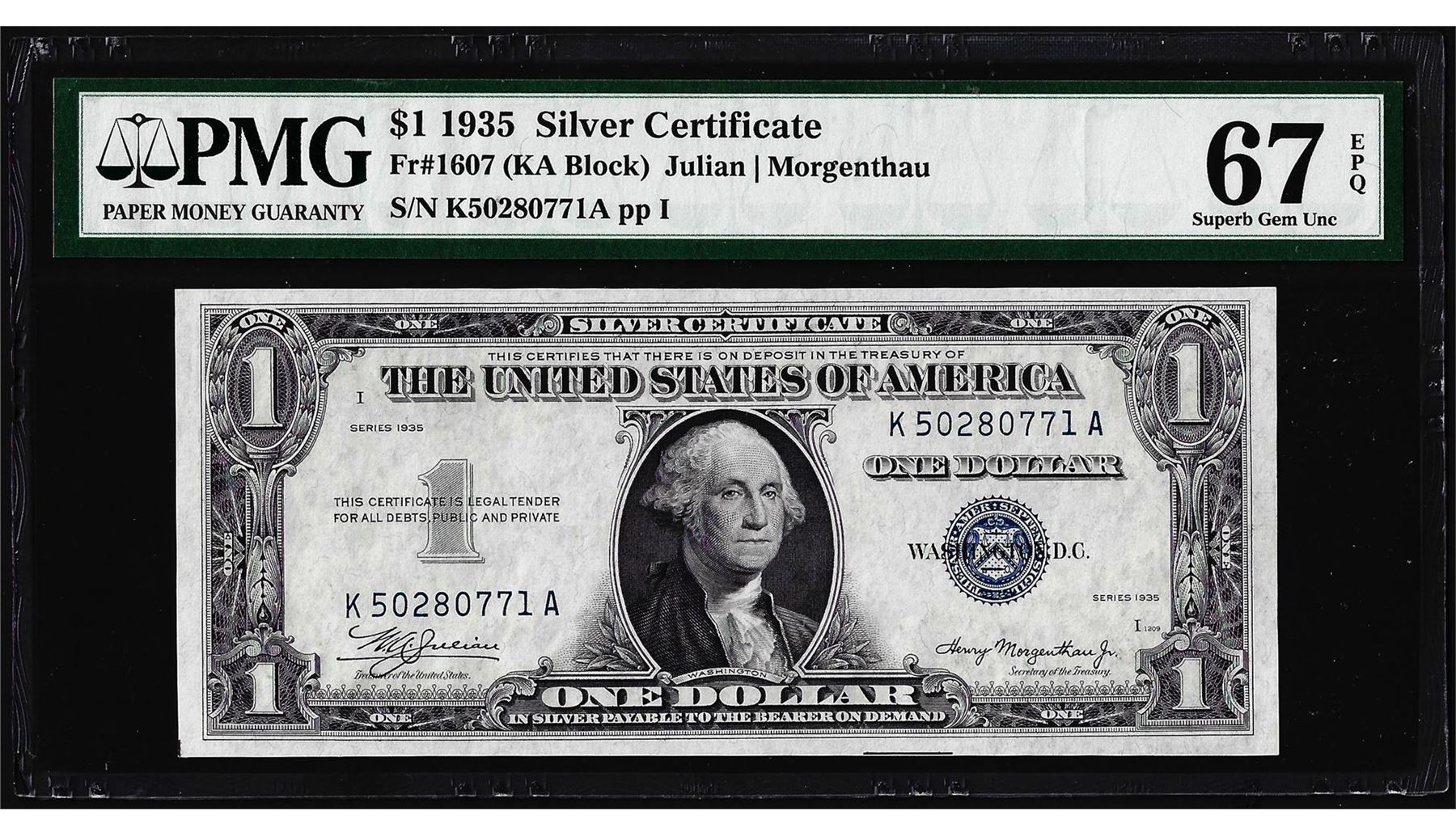 One 1935 $1 Silver Certificate Note Fr.1607 PMG Superb Gem Uncirculated 67EPQ. PMG Certified.
