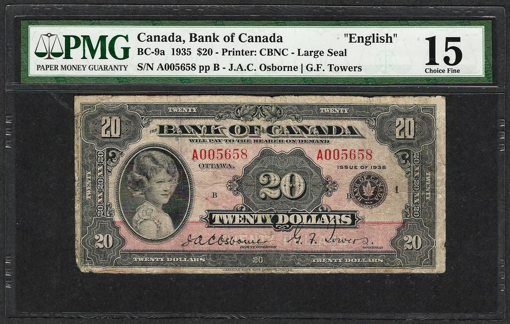 One 1935 $20 Bank of Canada "English" Bank Note BC-9a PMG Choice Fine 15. PMG Certified.