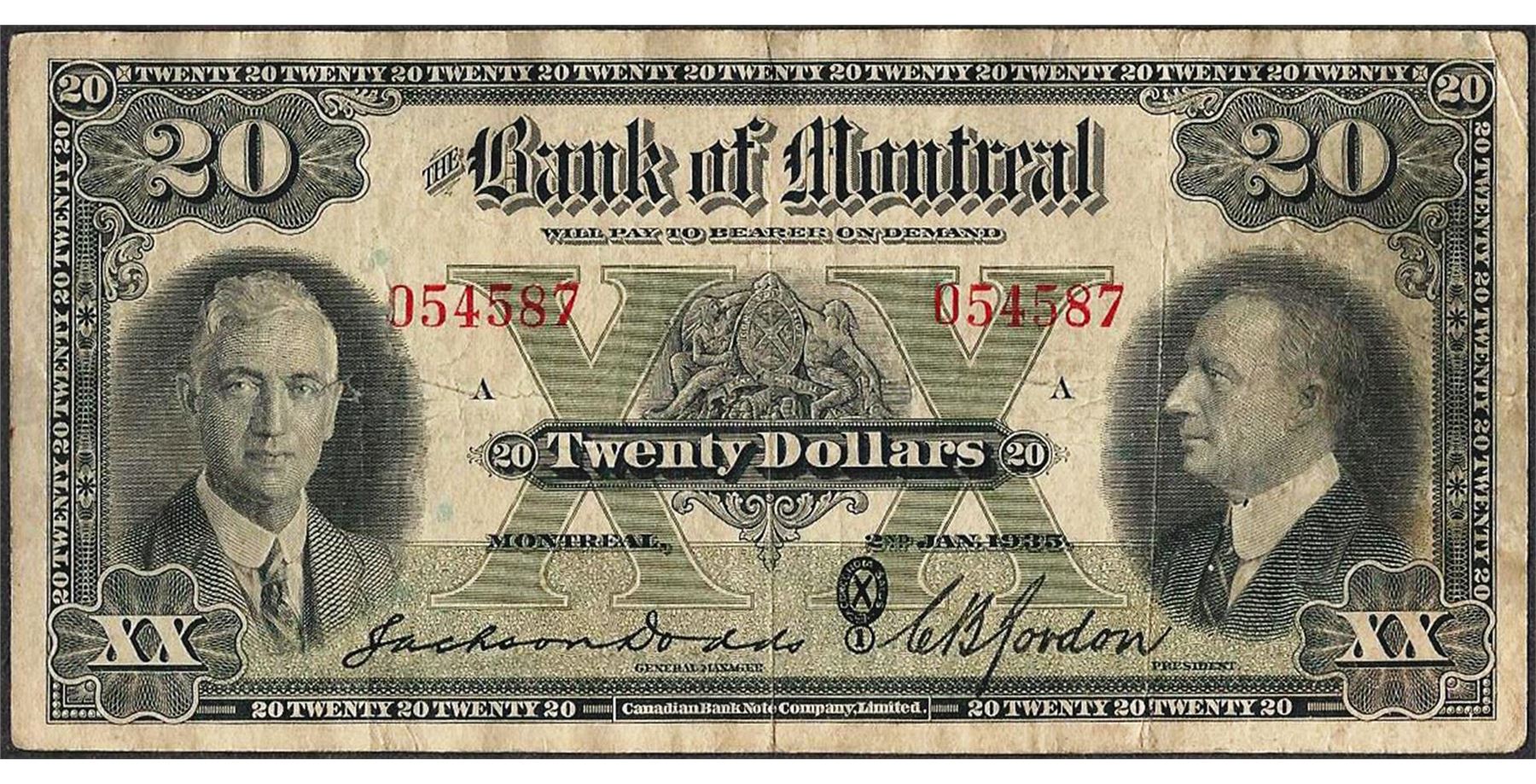 One 1935 $20 The Bank of Montreal Canada Note.