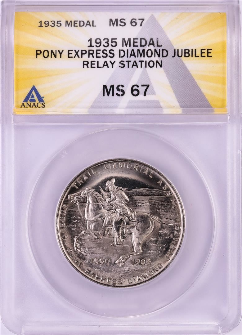 One 1935 Pony Express Diamond Jubilee Relay Station Medal ANACS MS67. ANACS Certified.
