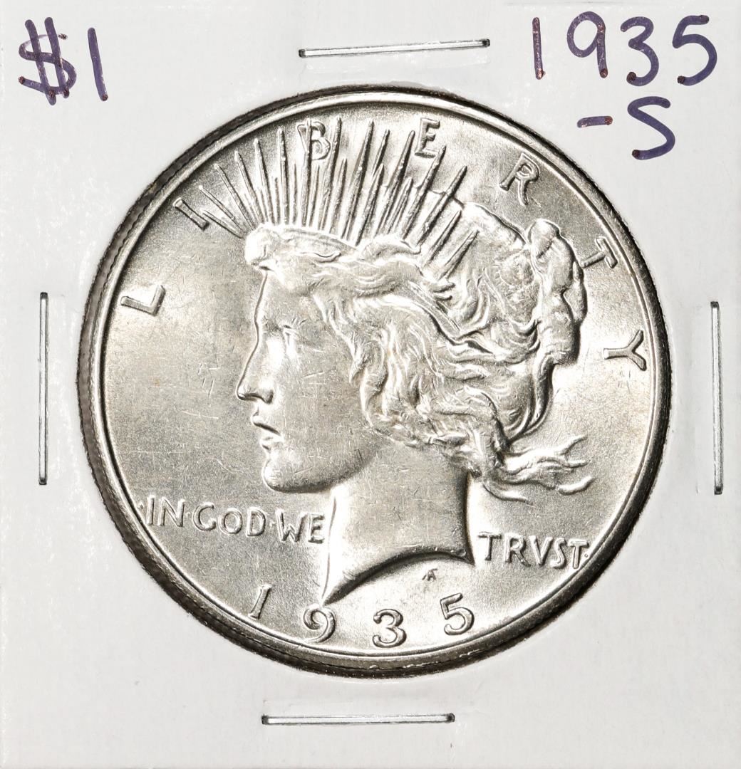 One 1935-S $1 Peace Silver Dollar Coin.