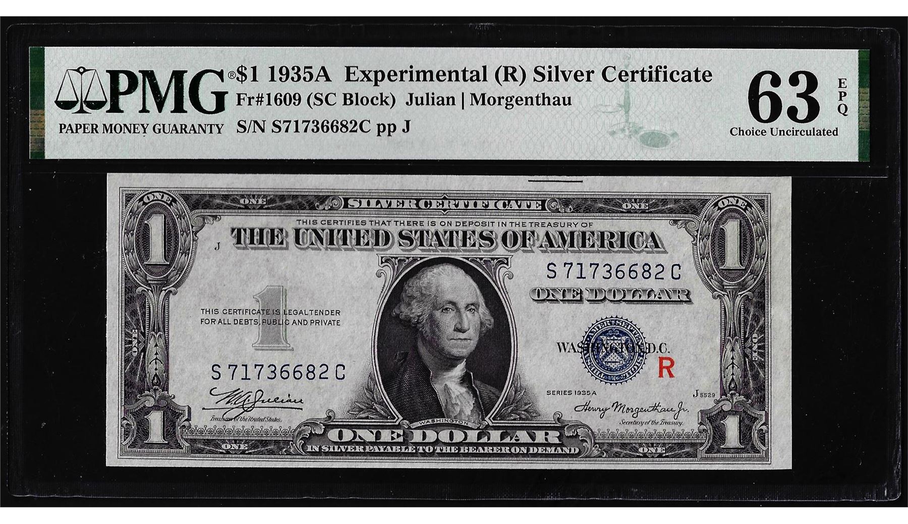1935A $1 Experimental  R  Silver Certificate Note Fr.1609 PMG Ch. Uncirculated 63EPQ