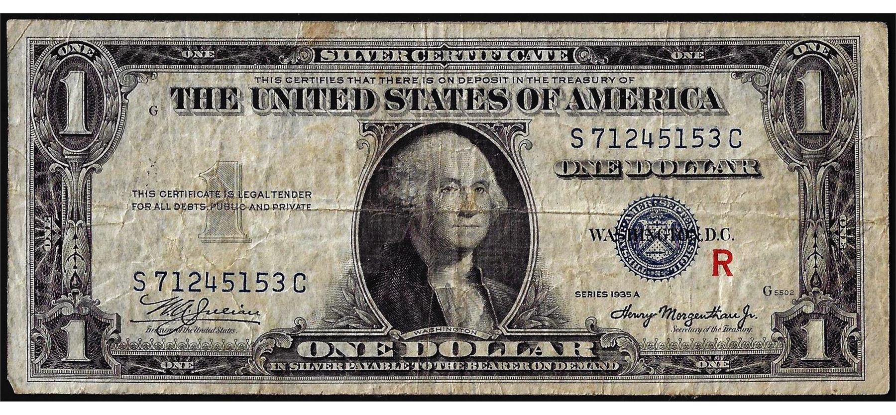 One 1935A $1 Experimental "R" Silver Certificate Note.