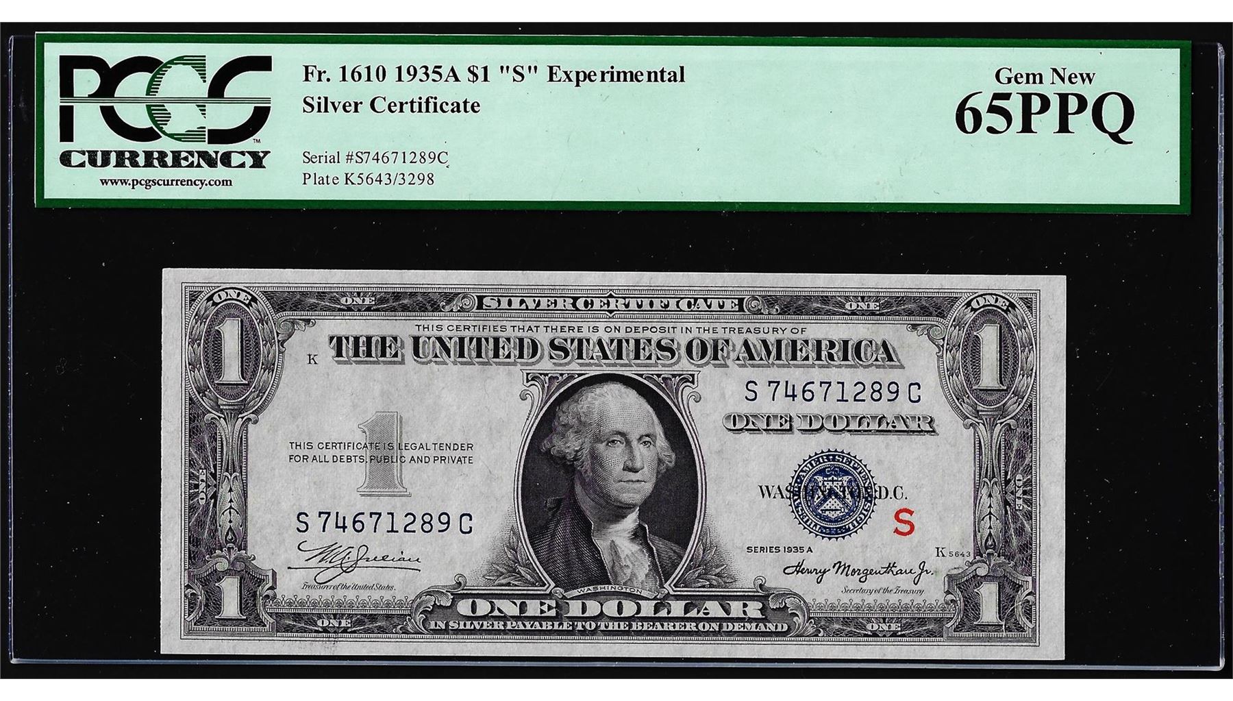 One 1935A $1 Experimental "S" Silver Certificate Note Fr.1610 PCGS Gem New 65EPQ. PCGS Graded.