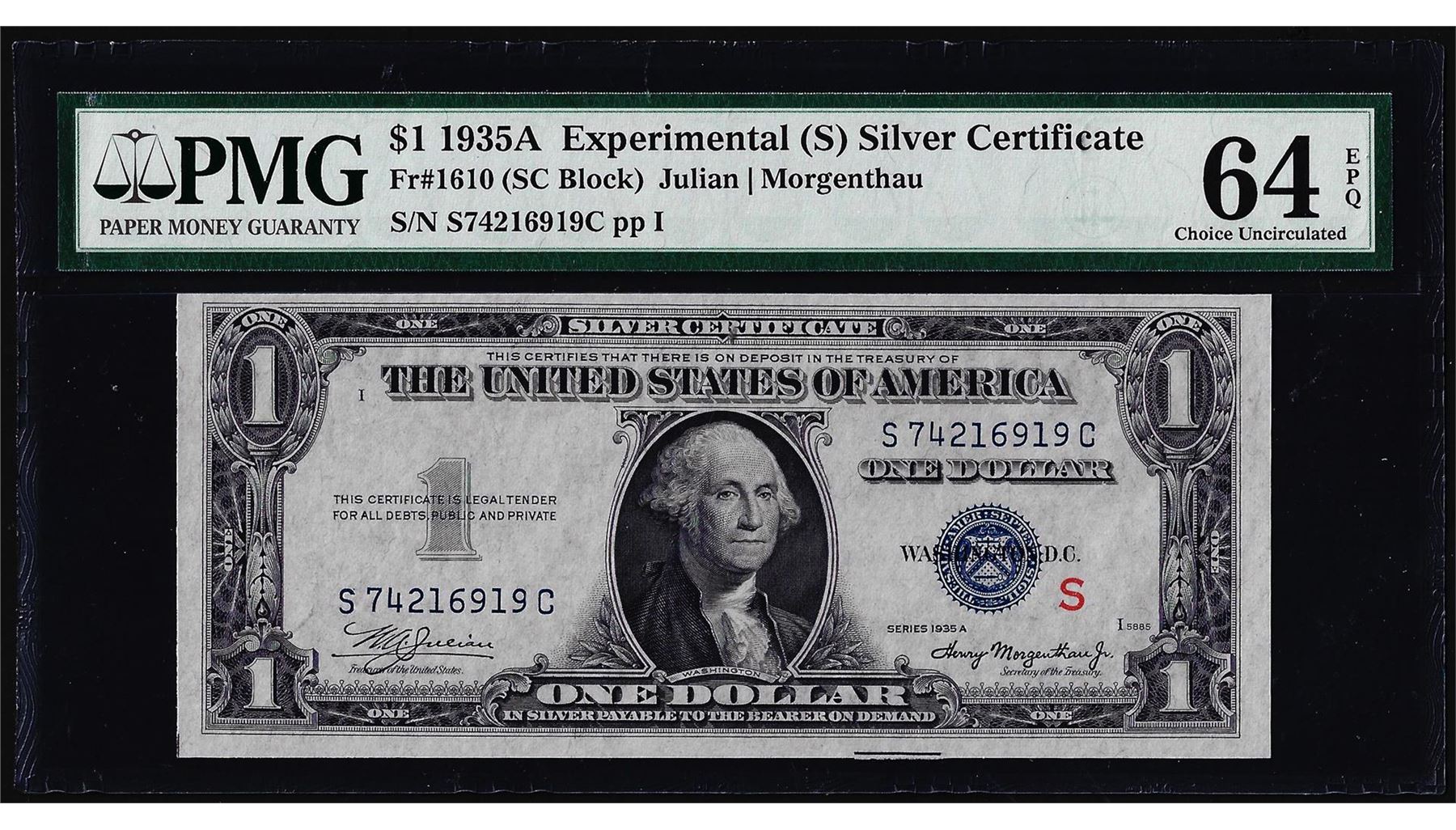 One 1935A $1 Experimental "S" Silver Certificate Note PMG Choice Uncirculated 64EPQ. PMG Certified.