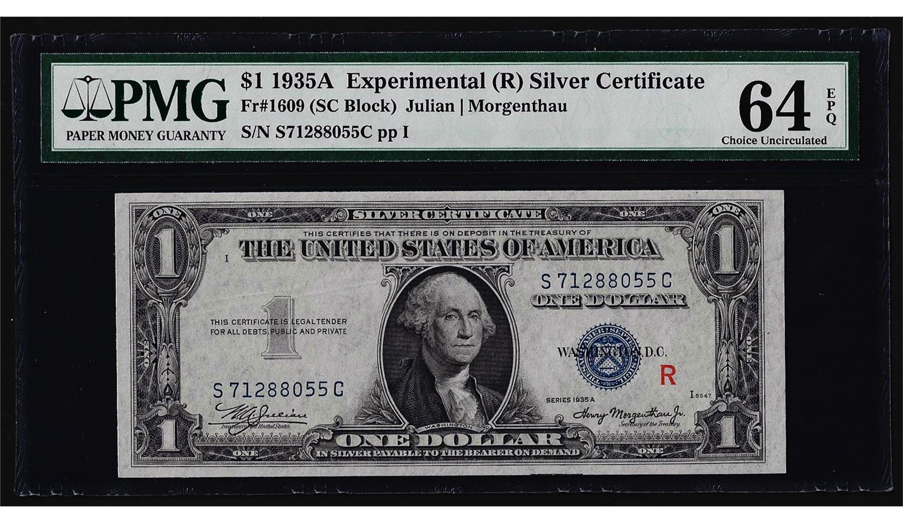 One 1935A $1 Experimental Silver Certificate Note Fr.1609 PMG Choice Uncirculated 64EPQ. PMG Certified.