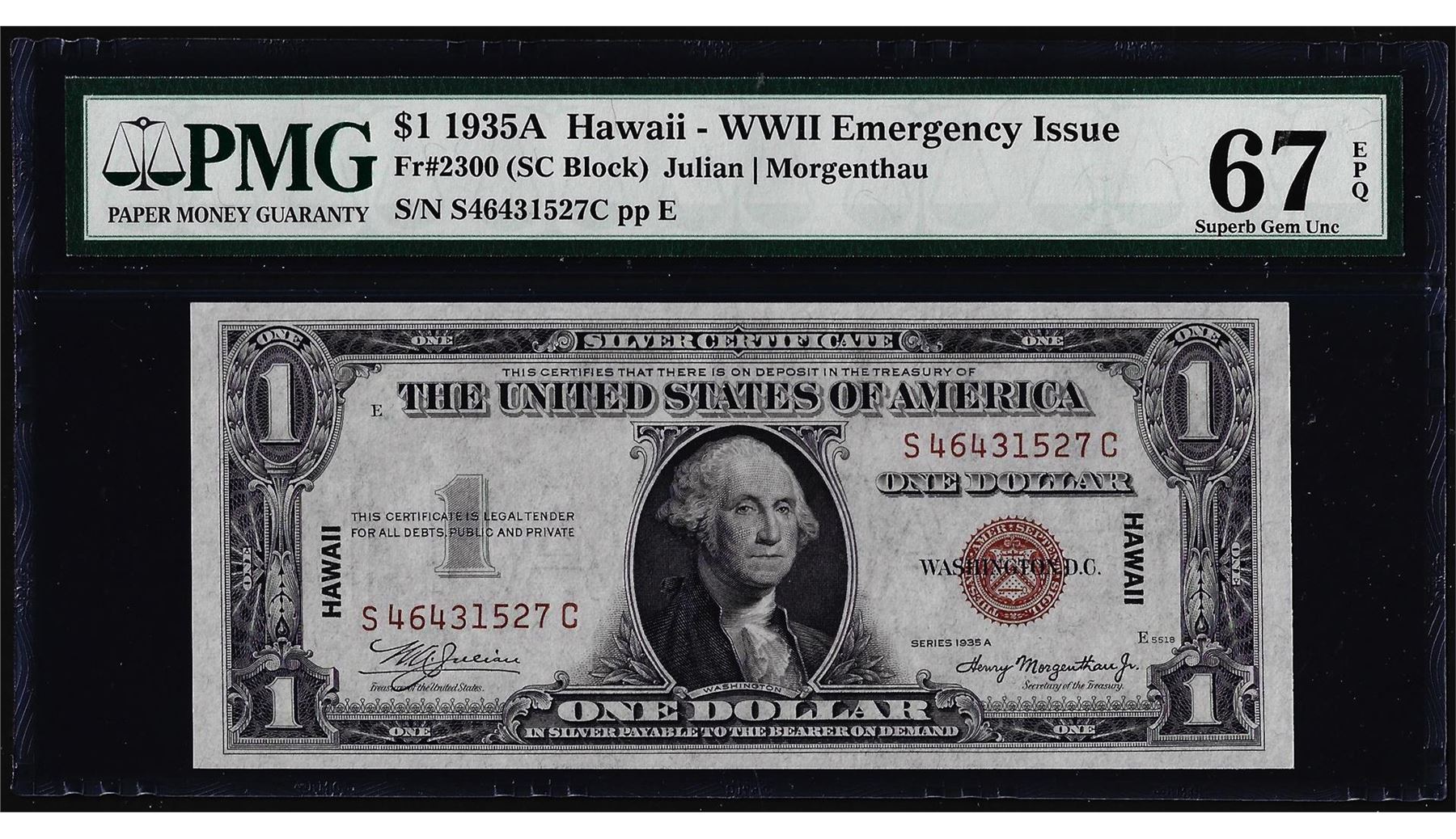 One 1935A $1 Hawaii Emergency Silver Certificate Note PMG Superb Gem Uncirculated 67EPQ. PMG Certified.