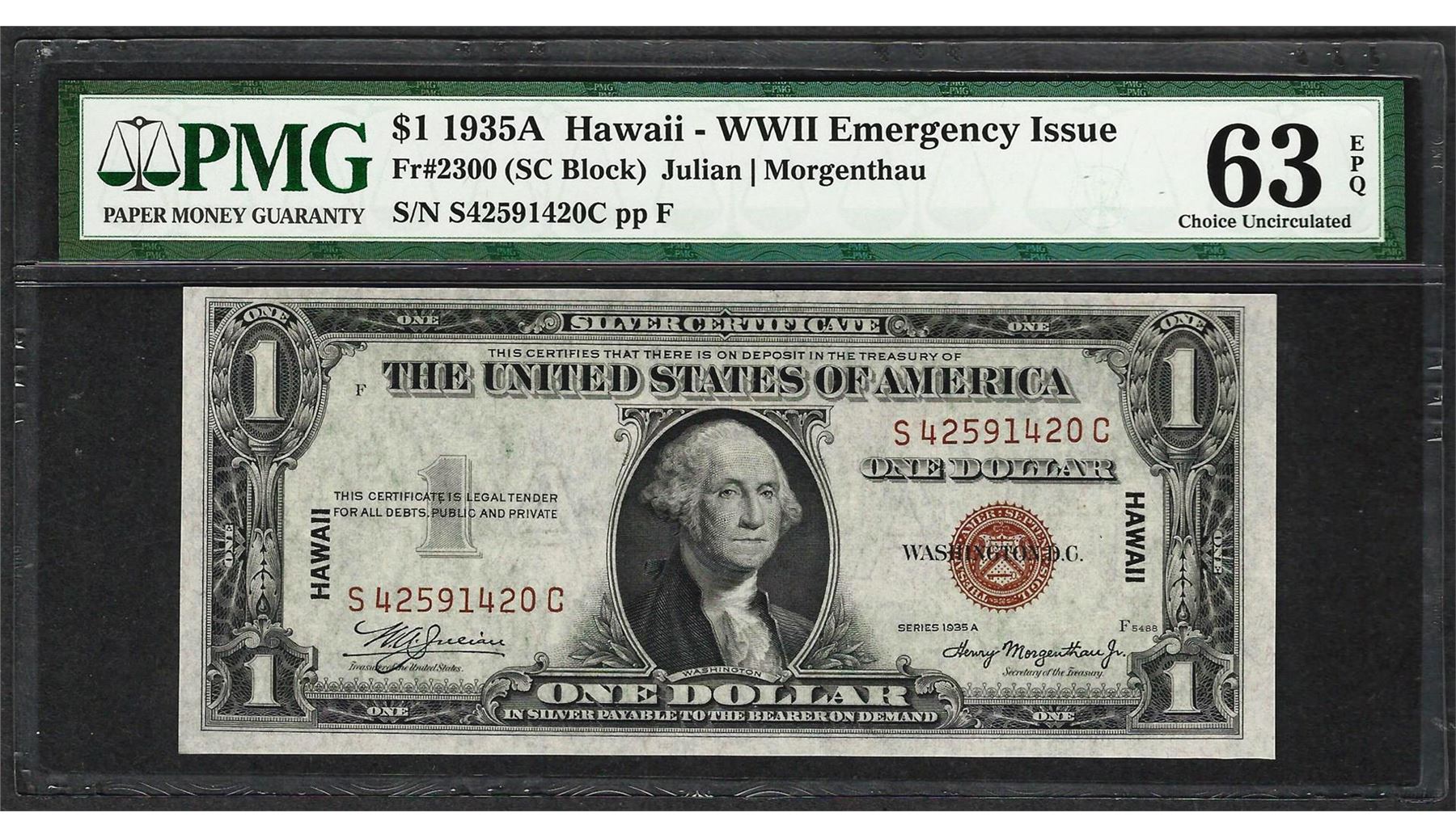 One 1935A $1 Hawaii Silver Certificate WWII Emergency Note PMG Choice Uncirculated 63EPQ. PMG Certified.