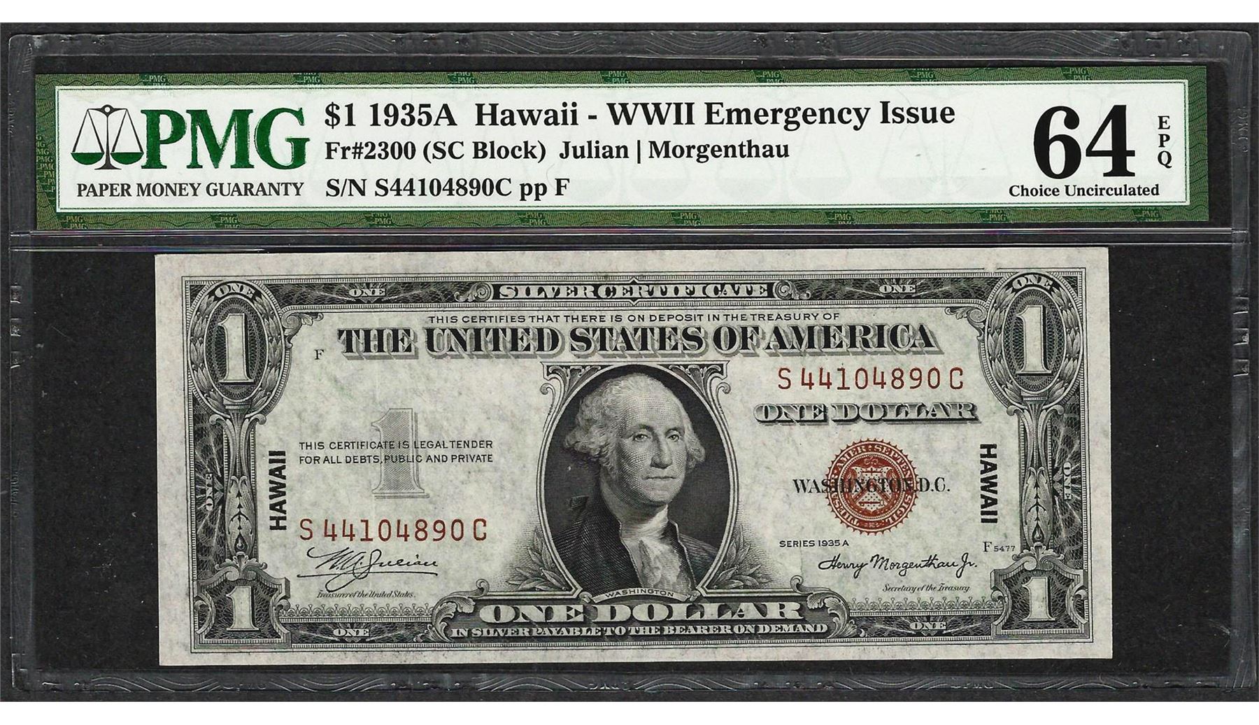 One 1935A $1 Hawaii Silver Certificate WWII Emergency Note PMG Choice Uncirculated 64EPQ. PMG Certified.
