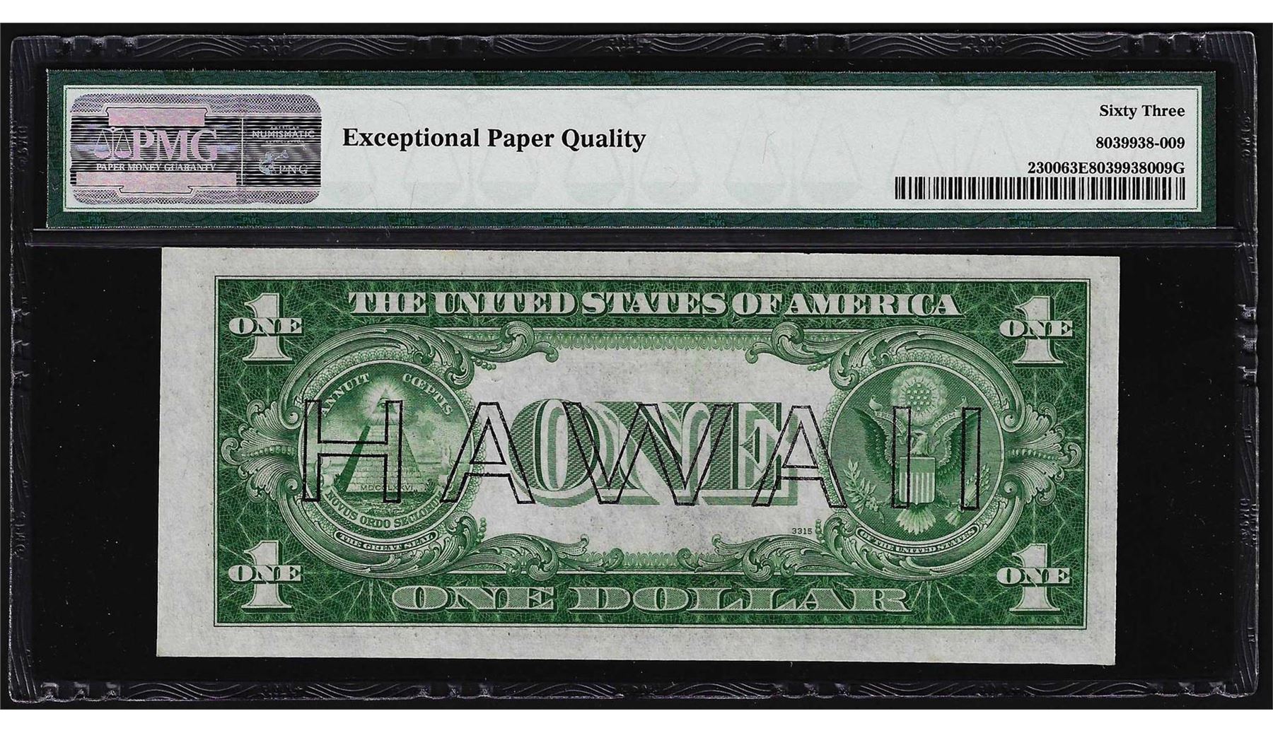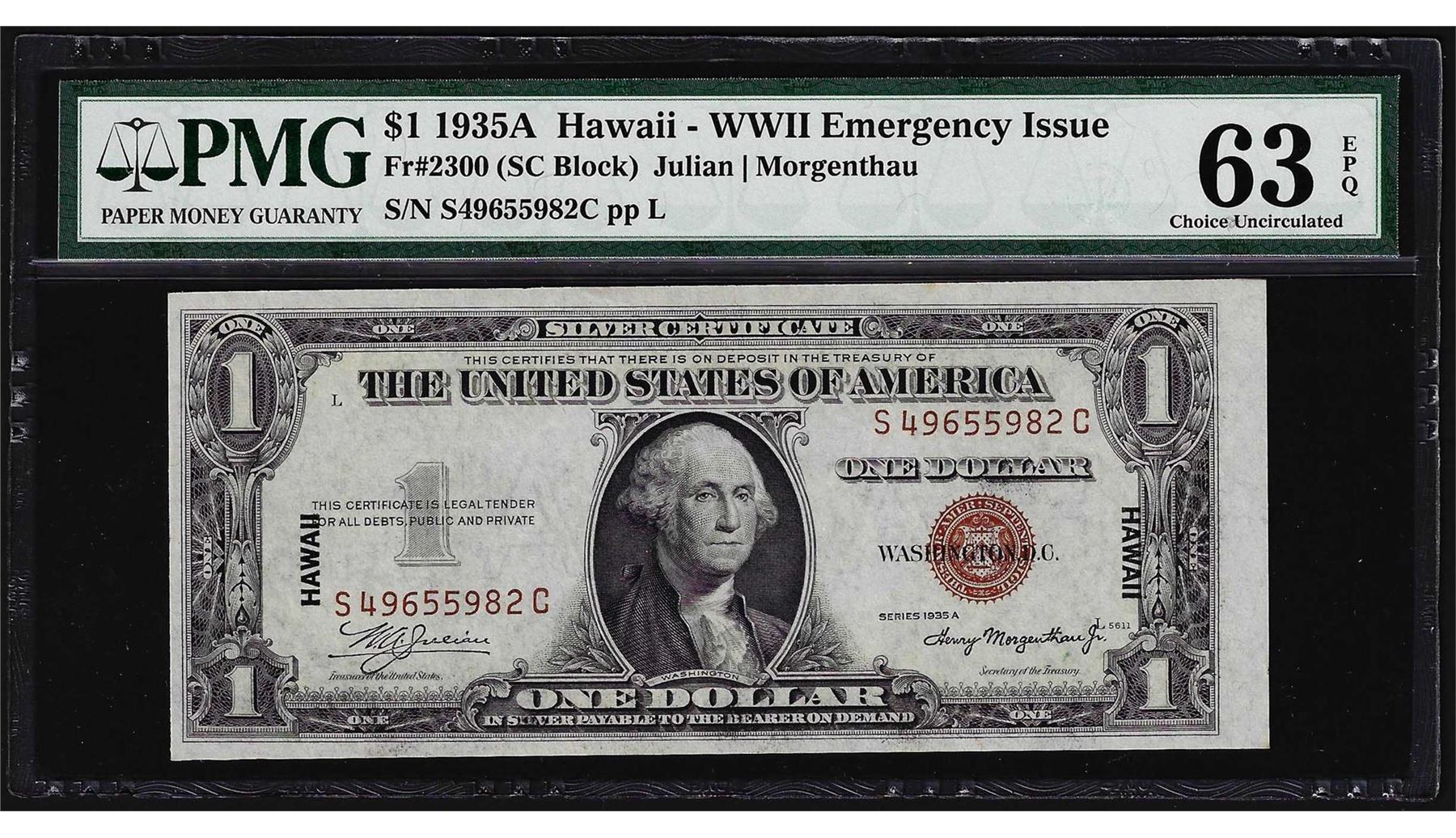 One 1935A $1 Hawaii Silver Certificate WWII Emergency Note PMG Choice Uncirculated 63EPQ. PMG Certified.